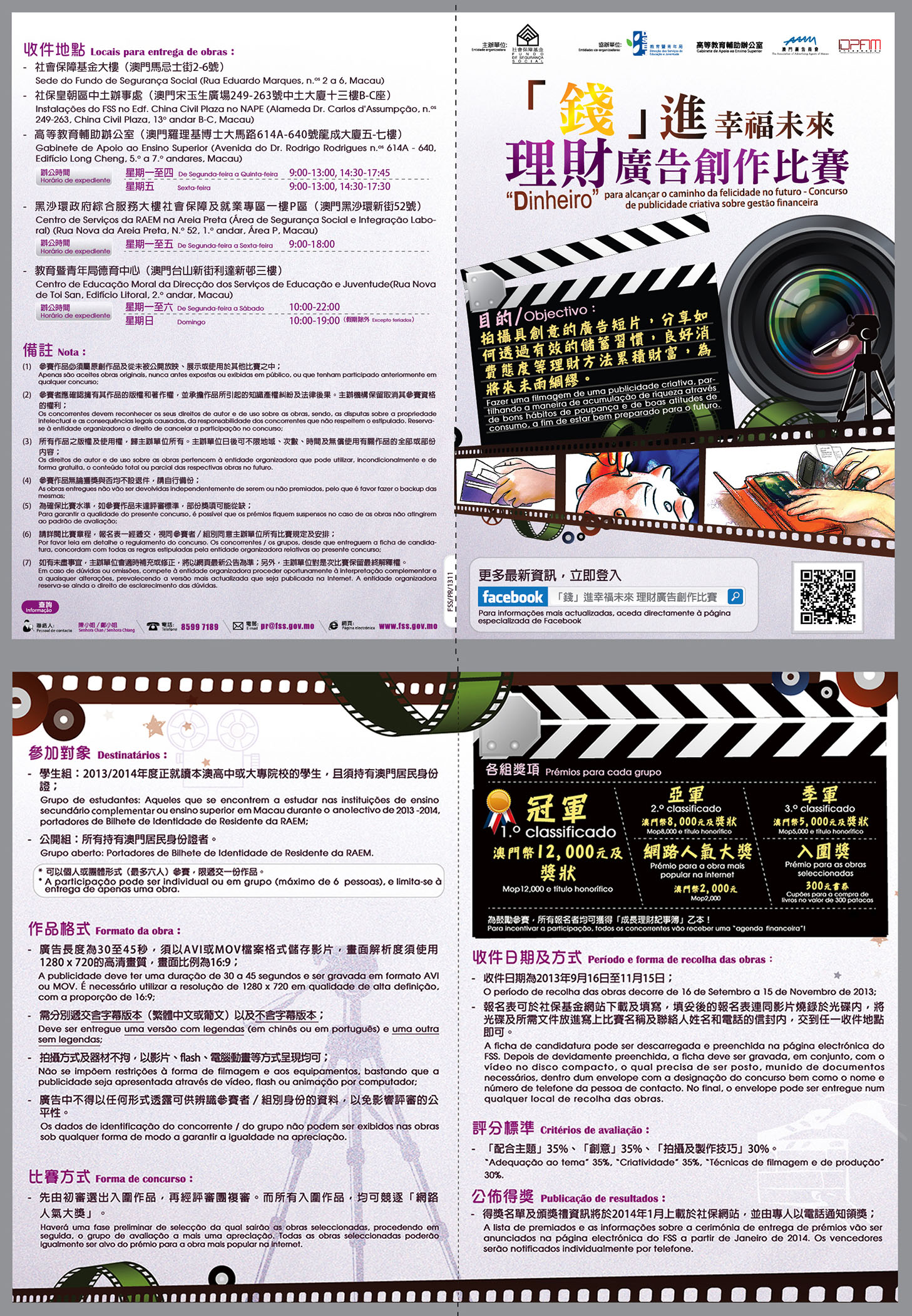 O concurso de publicidade criativa sobre gestão financeira - “Dinheiro” para alcançar o caminho da felicidade no futuro é uma actividade organizada pelo FSS, com a colaboração da Direcção dos Serviços de Educação e Juventude (DSEJ), do Gabinete de Apoio ao Ensino Superior (GAES), da Associação das Companhias e Serviços de Publicidade de Macau assim como de Investment Development Promotion Association in Macao. Os portadores de BIRM que estão a estudar nas instituições de ensino secundário complementar ou de ensino superior podem concorrer no grupo de estudantes, participando os outros residentes de Macau no grupo aberto. A participação pode ser feita, individualmente ou em grupo (6 pessoas no máximo), os interessados em concorrer, podem fazer a filmagem de uma publicidade com a duração de 30 a 45 segundos, que se adeqúe ao tema, sem restrições aos equipamentos mas em cumprimento do formato de vídeo exigido pela entidade organizadora e de outros requisitos.