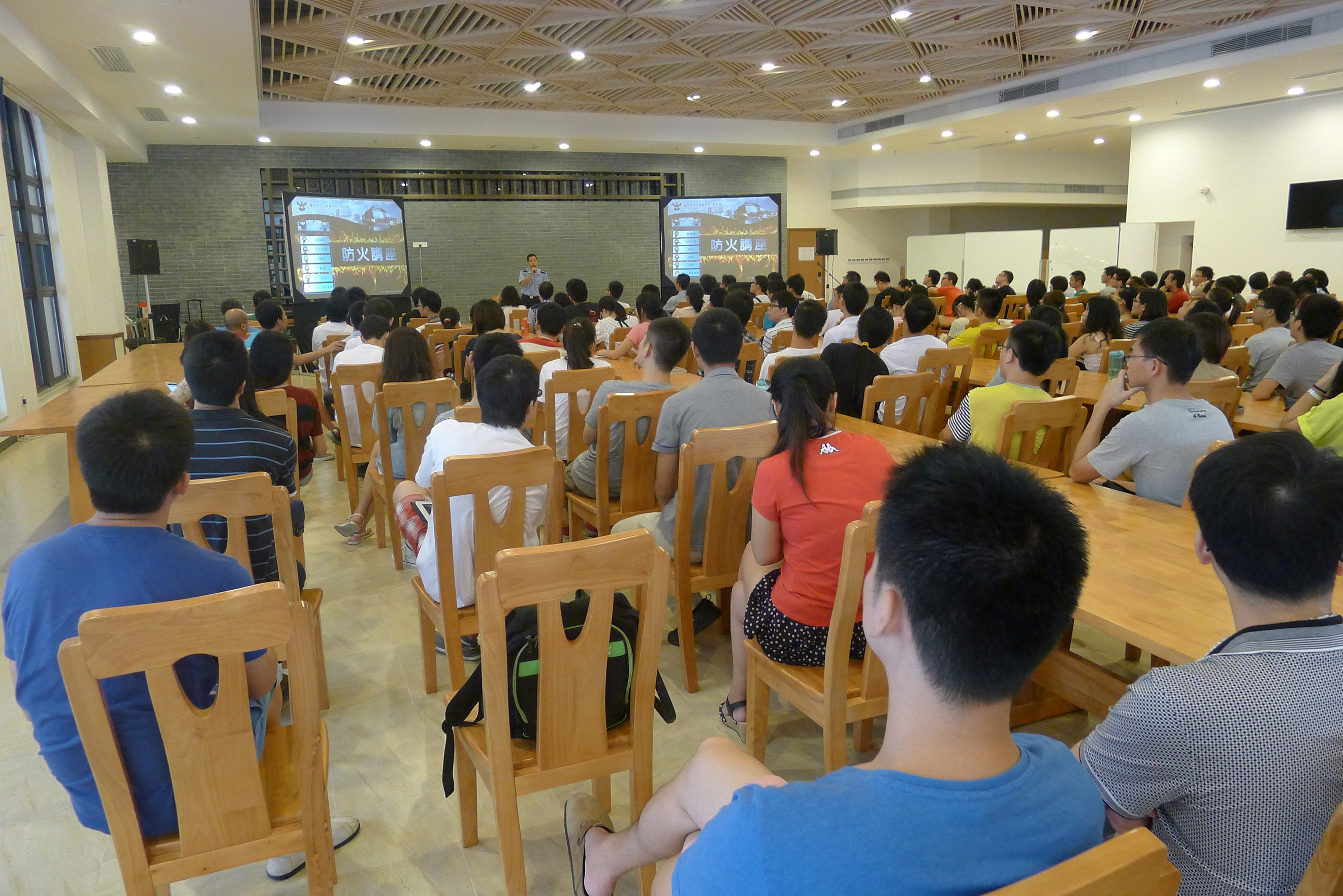 A palestra sobre conhecimentos de segurança contra incêndios foi efectuada, respectivamente, nos dias 23, 24 e 26 de Setembro do corrente ano, na qual participaram mais de 800 indivíduos em cinco sessões da palestra, cujo conteúdo inclui a teoria de combustão, as crises mais comuns em incêndios, as medidas de contingência a adoptar em caso de fogo, as técnicas de evacuação, as instalações e equipamentos comuns de segurança contra incêndios e o uso correto e seguro dos extintores.