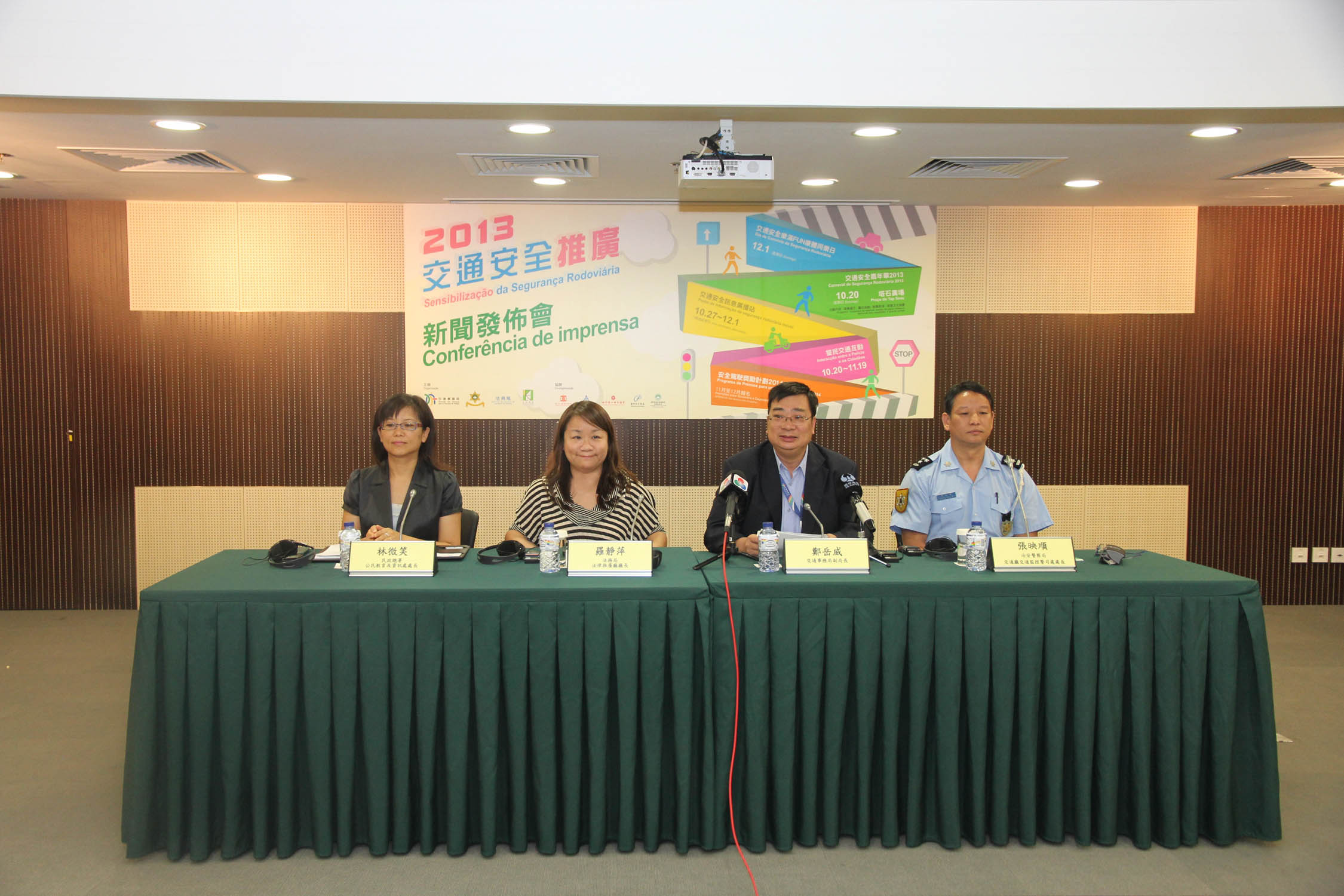 O Subdirector da Direcção dos Serviços para os Assuntos de Tráfego (DSAT), Chiang Ngoc Vai, a chefe do Departamento de Divulgação Jurídica da Direcção dos Serviços de Assuntos de Justiça (DSAJ), Lo Cheng Peng, o chefe do Comissariado de Controlo de Tráfego do Departamento de Trânsito do Corpo de Polícia de Segurança Pública (CPSP) , Cheong Ieng Son e a chefe da Divisão de Formação e Informação Cívicas do Instituto para os Assuntos Cívicos e Municipais (IACM), Lam Mei Sio apresentaram os pormenores da série de actividades de destaque da “Sensibilização da Segurança Rodoviária 2013”, na conferência de imprensa realizada hoje (dia 15) pelas 15h30 no Salão de Múltiplos Propósitos da DSAT.