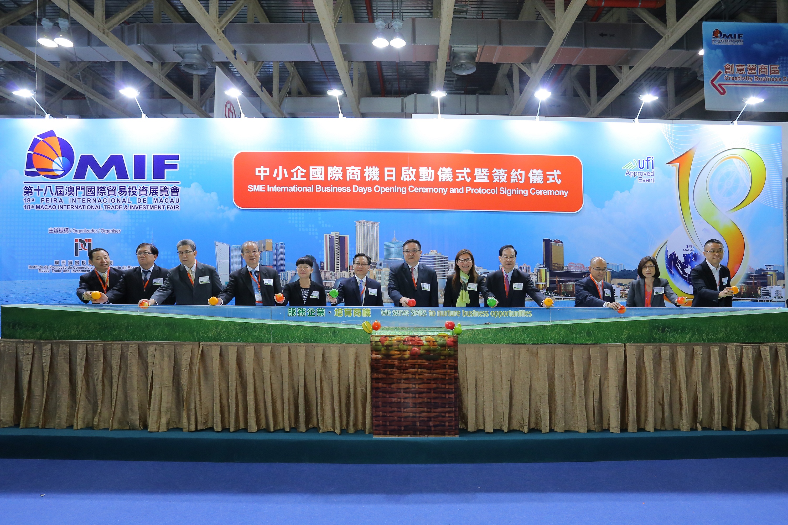 Realizou-se hoje a cerimónia de activação dos “Dias Internacionais de Oportunidades de Negócio para as Pequenas e Médias Empresas” da 18.ª MIF (adiante designada por “Dias de Oportunidades de Negócio”). Presidiram à mesma cerimónia o Presidente do Instituto de Promoção do Comércio e do Investimento de Macau (IPIM), Dr. Jackson Chang, o Presidente da Comissão Executiva da Associação Comercial de Macau, Dr. Kou Hoi In, as Vogais Executivas do IPIM, Dra. Echo Chan e Dra. Irene Va Kuan Lau, o Presidente da Comissão Executiva da Associação Industrial de Macau, Dr. Chui Yuk Lum, o Presidente da Comissão Executiva da Associação dos Fretadores de Macau, Dr. Tang Kuan Fong, o Presidente da Comissão Executiva da Associação de Gestão de Macau, Dr. Lau Veng Seng, o Vice-Presidente da Comissão Executiva da Associação das Pequenas e Médias Empresas de Macau, Dr. Daniel Iong, a Subdirectora Geral do Centro de Produtividade e Transferência de Tecnologia de Macau, Dra. Mok Iun Lei, o Supervisor da Associação de Comerciantes Têxteis de Macau, Dr. Alain Ku, o Consultor da Delegação Comercial do Conselho para a Promoção do Comércio Internacional da China (CCPIT), Dr. Tian Min, e o Presidente da Licensing & Franchising Association of Hong Kong, Dr. Wilson Lee.