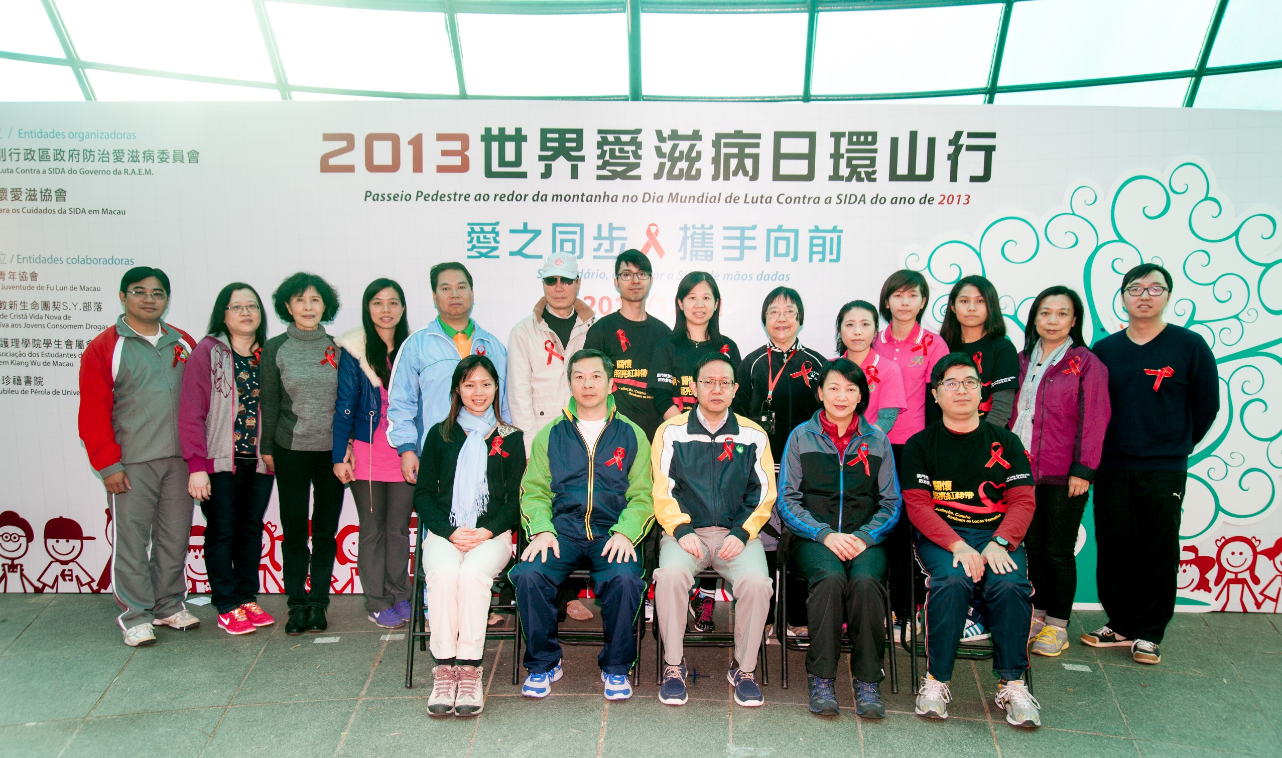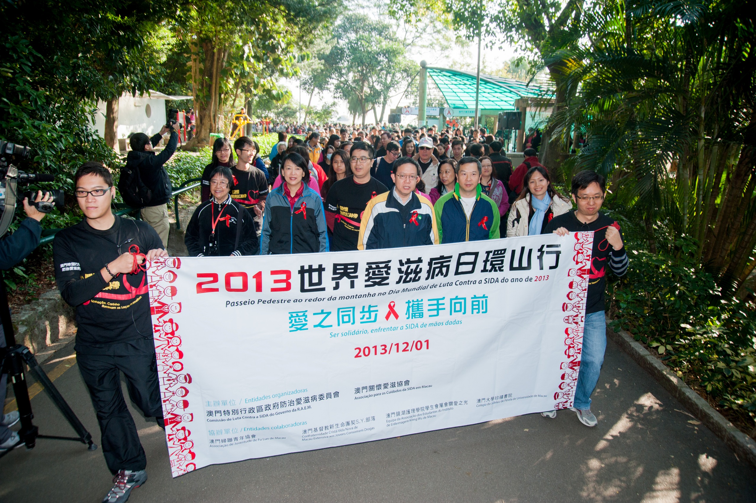 Hoje (dia 1 de Dezembro) é o Dia Mundial de Luta Contra a SIDA, a Comissão de Luta Contra a SIDA do Governo da Região Administrativa Especial de Macau, em conjunto com a Associação para os Cuidados da SIDA em Macau organizaram a actividade do “Passeio Pedestre ao Redor da Montanha no Dia Mundial de Luta Contra a SIDA do ano de 2013”, tendo como tema “Ser solidário, enfrentar a SIDA de mãos dadas”. Os convidados de honra presentes incluíam: o Chefe do Centro de Prevenção e Controlo das Doenças dos Serviços de Saúde, Dr. Lam Chong, o Chefe da Divisão de Prevenção Primária do Instituto de Acção Social, Dr. Hoi Va Pou, o Director do Centro de Educação Permanente da Direcção dos Serviços de Educação e Juventude, Dr. Cheong Kuai San, o Presidente do Conselho da Associação para os Cuidados da SIDA em Macau, Dr. Cheang Si Lok, bem como a Dra. Shu Bo Yee do Centro de Prevenção e Protecção da Saúde dos Serviços de Saúde de Hong Kong (Programa especial de prevenção).