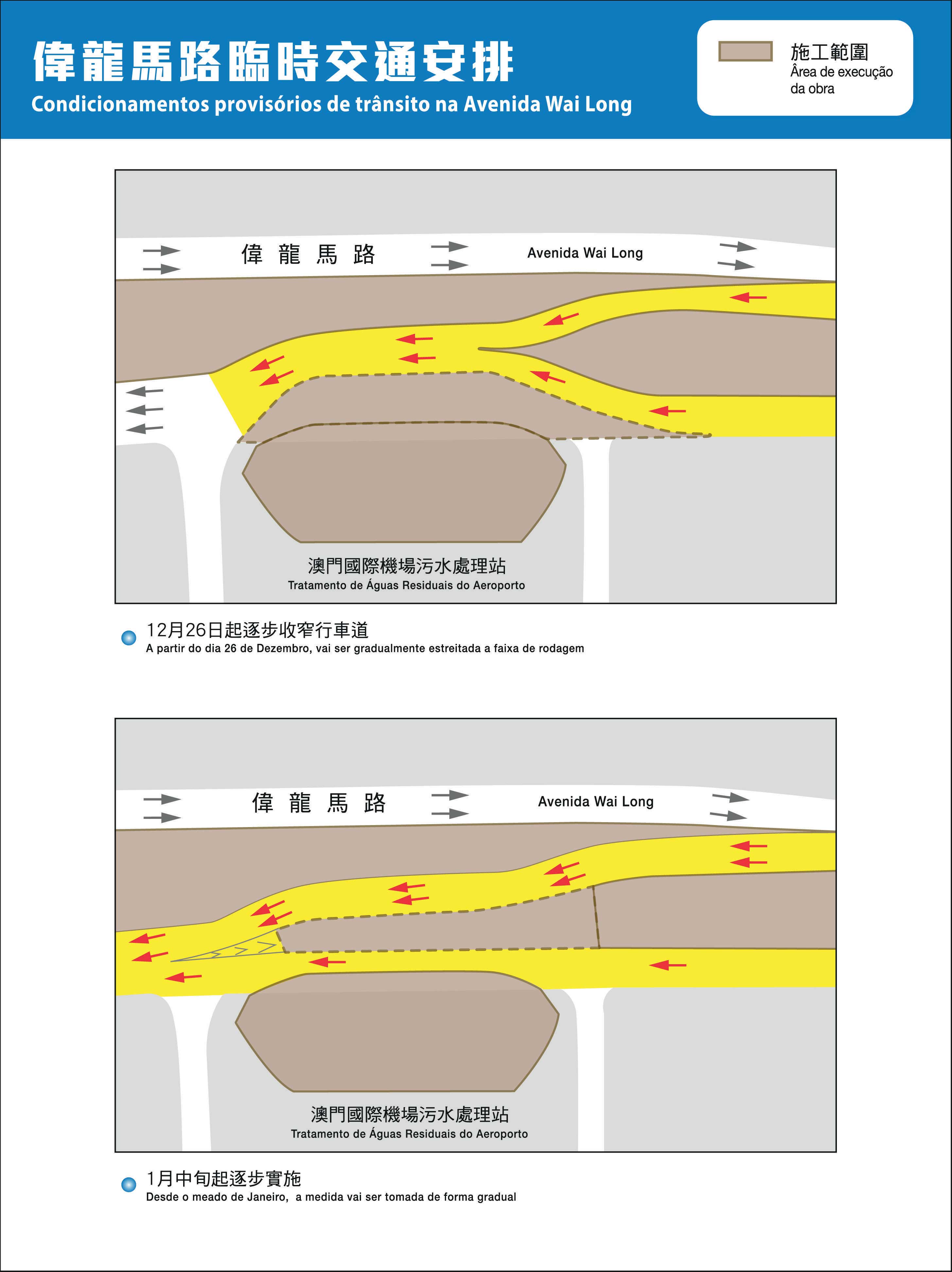 A partir de quinta-feira, o empreiteiro da obra do Metro Ligeiro vai colocar, de forma faseada e temporária, as vedações num troço da Avenida Wai Long, junto da Estação de Tratamento de Águas Residuais do Aeroporto, no sentido de construir uma estrutura do suporte provisório, o qual irá também servir da estrutura do suporte do viaduto na hora de elevação e montagem das peças pré-fabricadas. Naquela altura em que o empreiteiro colocará temporariamente as vedações numa parte das faixas de rodagem, pelo que se manterá a circulação em duas vias do Aeroporto Internacional de Macau em direcção à Universidade de Ciência e Tecnologia. Tendo como objectivo equilibrar as necessidades entre a execução da obra e a deslocação da população, alguns trabalhos, que provocarão o maior impacto ao trânsito, serão realizados durante a noite e a madrugada, no sentido de minimizar os impactos. Durante aquele período, uma das faixas de rodagem do troço supracitado passará a ser feita em uma via.