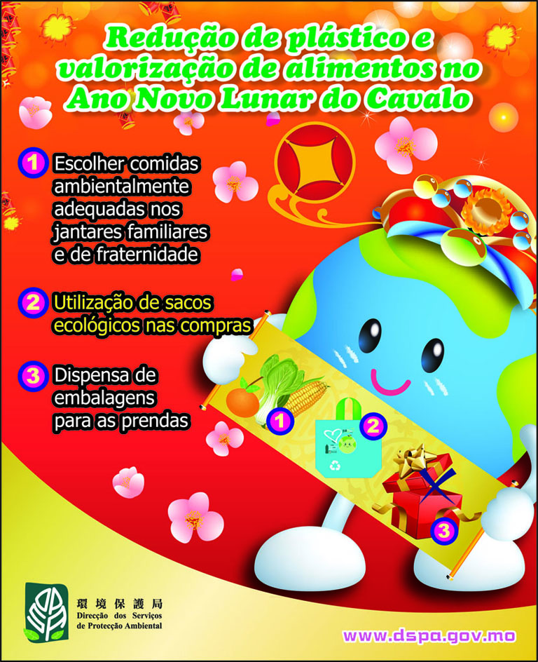 O Ano Novo Lunar do Cavalo já está a chegar. Nesta altura em que as famílias estão ocupadas com a compra de produtos para as festas e com a limpeza geral da casa, a DSPA apela à população para, ao mesmo tempo que se celebra a importante festa tradicional, actuar no sentido de apoiar a preservação do ambiente. Por exemplo: levar e utilizar o próprio saco ecológico nas compras, não solicitar ou reduzir o uso de sacos de plástico, porque, tanto durante o processo de produção, como na incineração de sacos de plástico, é formado um gás chamado dióxido de carbono (CO2)com efeito de estufa, que conduz ao aquecimento climático global. Segundo o resultado de dados estatísticos, a quantidade anual de dióxido de carbono emitido pelo uso de sacos de plástico é equivalente à quantidade anual de gás absorvido por cerca de 600 milhões de árvores.