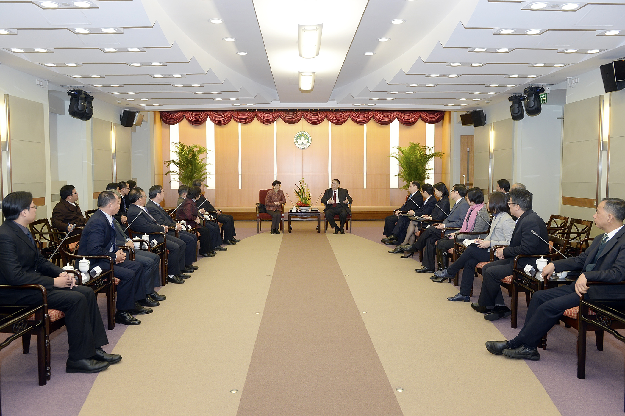 O Chefe do Executivo, Chui Sai On, e a presidente, Ho Sut Heng, e novos corpos gerentes da Federação das Associações de Operários de Macau (FAOM) trocaram impressões sobre assuntos laborais, hoje (24 de Fevereiro), durante um encontro, na Sede do Governo.