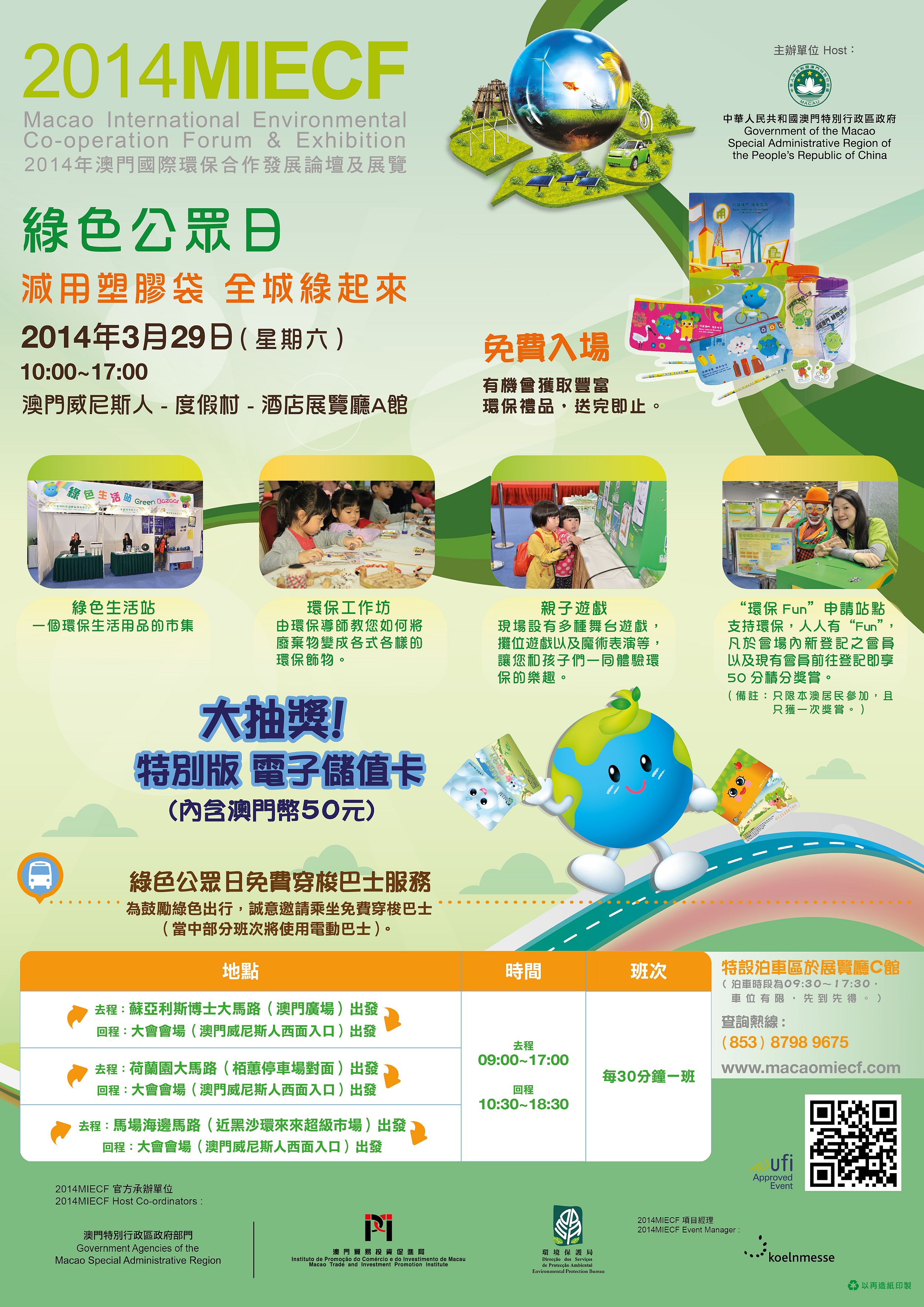 O 2014MIECF tem por objectivo melhorar a sensibilização dos cidadãos e visitantes para a importância da protecção ambiental. Para o dia 29 de Março está agendado o chamado "Dia Verde do Público", cujo horário será entre as 10H00 e as 17H00. A entrada é gratuita e será bem-vinda a participação do público. Neste ano, o "Dia Verde do Público" está subordinado ao tema “Não aos sacos de plástico, Sim a uma cidade mais verde!”, com o intuito de incentivar mais pessoas a utilizar os seus próprios sacos de compras recicláveis na vida diária e juntar forças para dizer “não” ao uso de sacos de plástico!