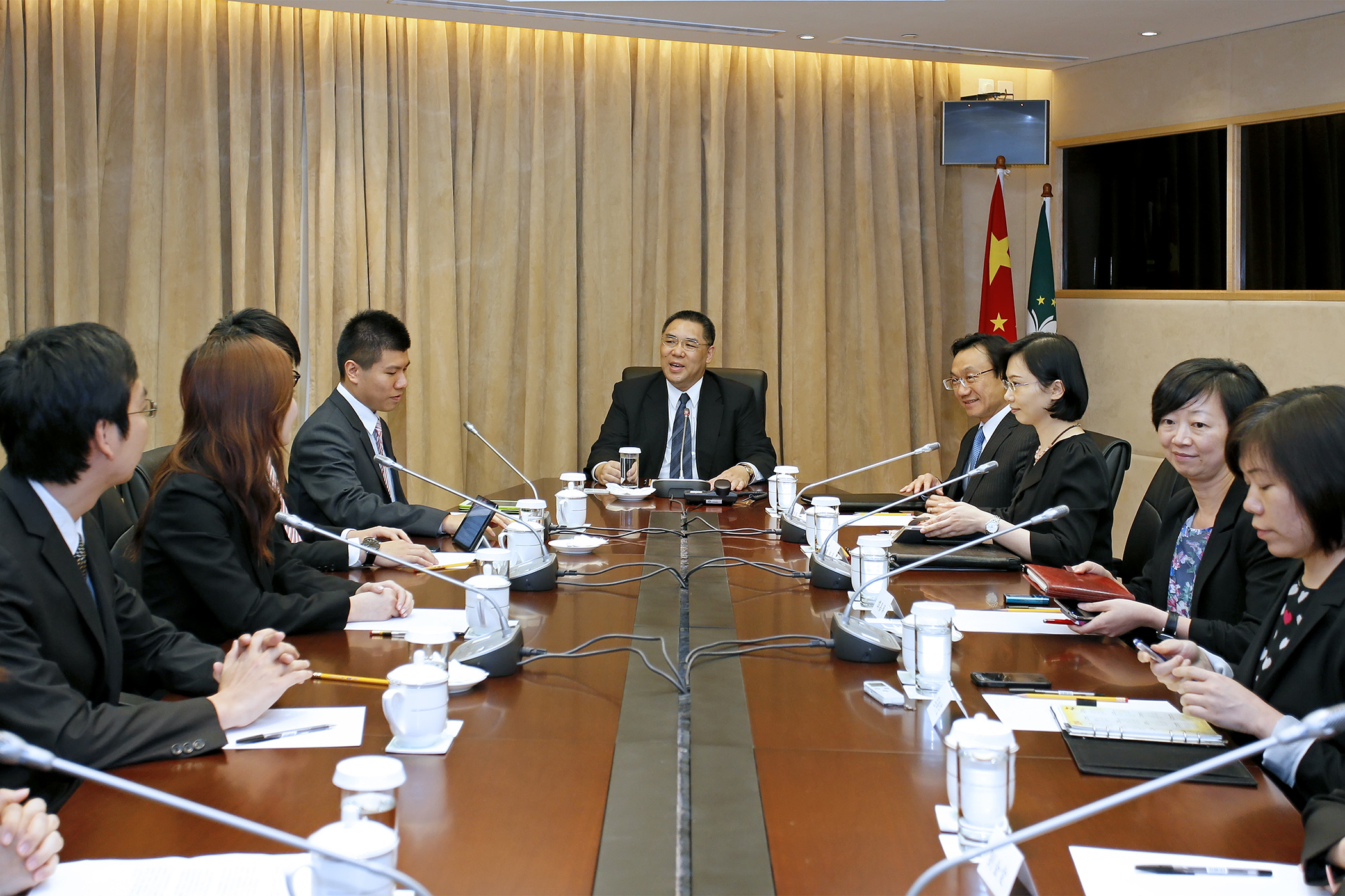 O chefe do Gabinete do Chefe do Executivo, Alexis Tam, a secretária-geral do Conselho Executivo, O Lam, e, da parte da Associação, a secretária-geral, Ng Pek San, e o vice-presidente do Conselho Fiscal, Ao Ieong Wai In, estiveram também presentes no encontro.