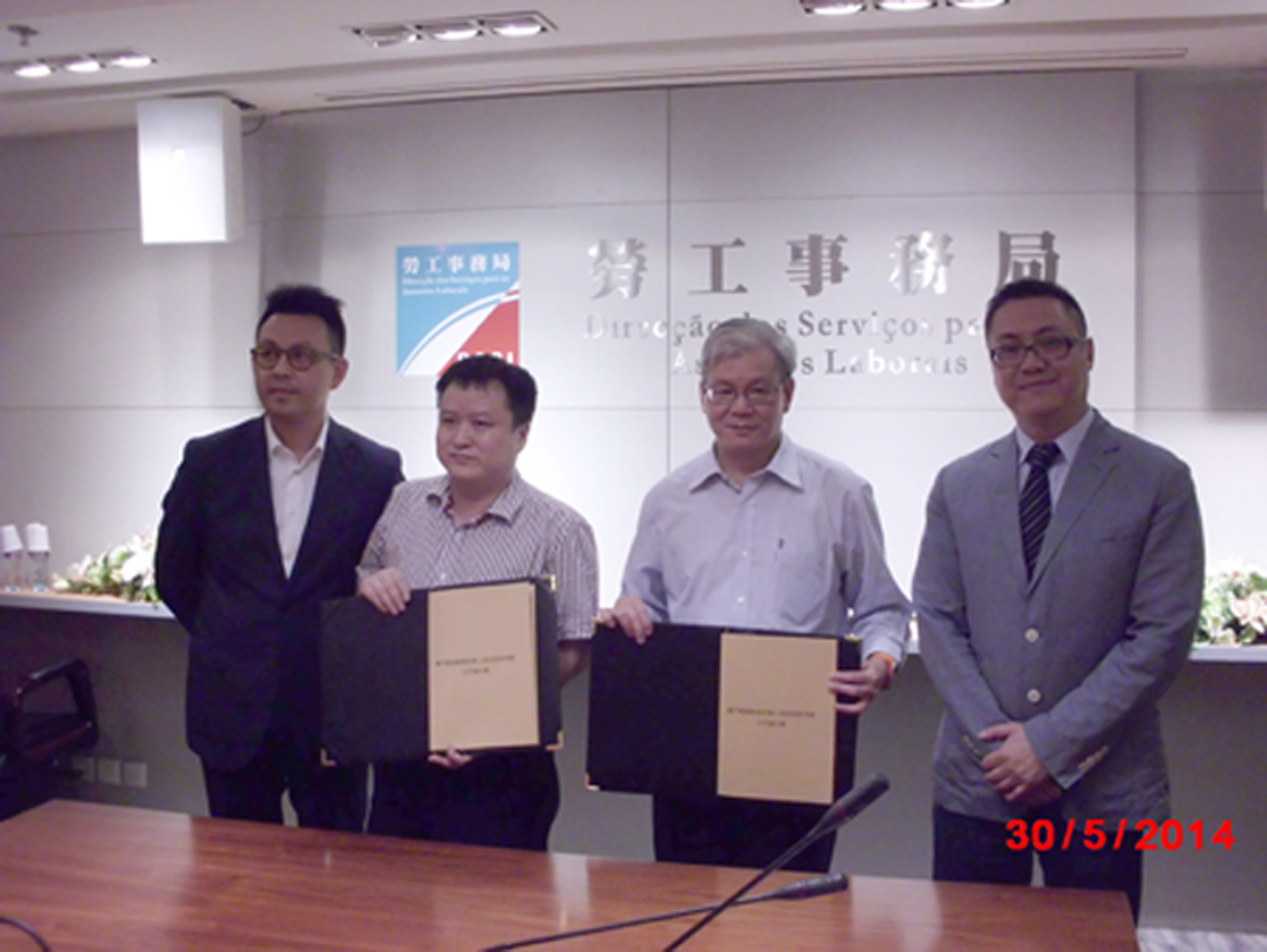 Na cerimónia de assinatura estiveram presentes o Subdirector da DSAL, Lau Wai Meng, o Subdirector da “Zhuhai Vocational Training School of Quality Security”, Zhou HongJun, o Subdirector Zhang Zhaojian, o Presidente do Instituto para o Desenvolvimento e Qualidade de Macau, Tam Lap Mou e o Director Fong Sio Long.