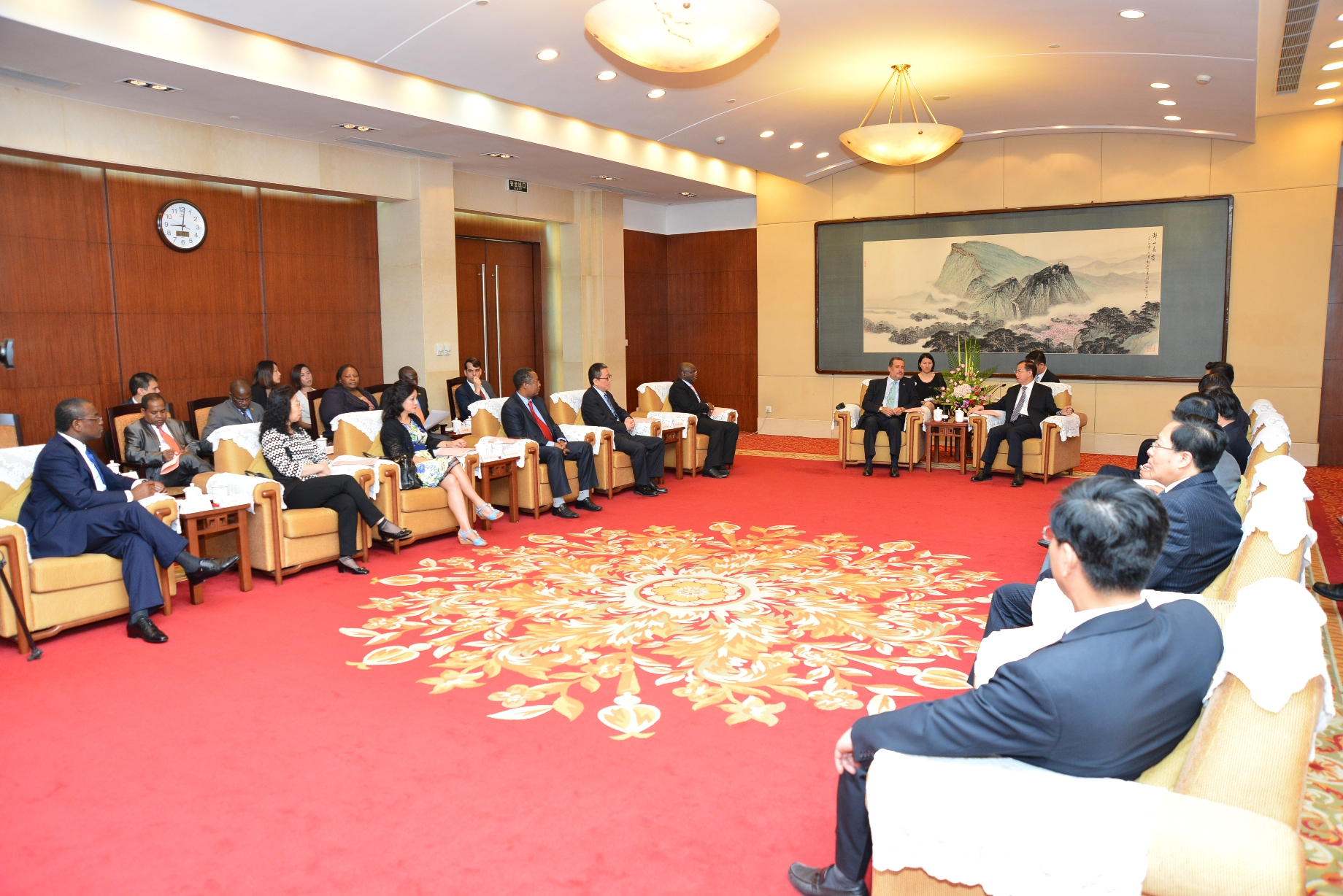 Durante o encontro, o Vice-Governador, Dr. Fu Ziying, fez uma apresentação sobre a situação económica e social da Província de Jiangsu, e ainda, a cooperação entre a sua Província e os Países de Língua Portuguesa, destacando alguns exemplos de grandes empresas já instaladas em Angola, Brasil, Portugal e Moçambique. O Embaixador de Cabo Verde, Dr. Júlio Morais, manifestou os seus agradecimentos ao Governo da Província de Jiangsu pelo acolhimento e sugeriu que nas áreas de cooperação a serem discutidas na 4ª. Cimeira de Desenvolvimento Comercial e Industrial de Jiangsu, Macau e dos Países de Língua Portuguesa, a ser realizada nos dias 23 a 26 de Outubro próximo, pudesse envolver também as áreas da pesca e da indústria de ciências e tecnologia, para além do comércio e investimento, agricultura, educação e turismo. O Vice-Governador manifestou a concordância da proposta apresentada pelos Países de Língua Portuguesa, tendo indicado aos dirigentes dos departamentos da Província de Jiangsu, presentes no encontro, para intensificar a cooperação com os Países de Língua Portuguesa, principalmente na constituição de parcerias entre os empresários; mais adiantou que o Governo da Província de Jiangsu iria organizar delegações oficial e empresarial, em visitas de estudo, para desenvolver a cooperação agrícola com os Países de Língua Portuguesa. Mais reforçou a necessidade de intensificar os contactos com o Secretariado Permanente do Fórum de Macau, bem como utilizar Macau como plataforma de serviços entre a China e os Países de Língua Portuguesa, a fim de reforçar a cooperação diversificada entre a Província de Jiangsu e esses Países. Por fim, os Embaixadores e diplomatas dos Países de Língua Portuguesa na China e o Secretariado Permanente manifestaram que irão prestar o maior apoio na concretização dos objectivos traçados na cooperação mútua entre a Província de Jiangsu, Macau e os Países de Língua Portuguesa.