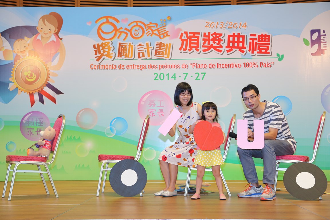 Para distinguir os encarregados de educação que participaram, activamente, nestas actividades, a DSEJ realizou a cerimónia de atribuição de prémios do Plano de Incentivo 100% Pais do ano lectivo 2013/2014,a qual teve lugar no Centro de Convenções do Centro de Ciência de Macau, no dia 27 de Julho, pelas 10:30 horas. Estiveram presentes na cerimónia, a directora e subdirectora da DSEJ, Leong Lai e Kuok Sio Lai, a subdirectora da DSC, Rosa Leong, a chefe da Divisão de Formação e Informação Cívicas do IACM, Lam Mei Sioe mais de 30 representantes das instituições educativas e das associações.