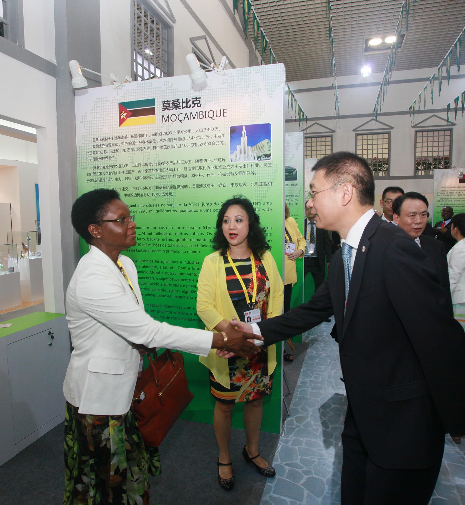 Na manhã do dia 8 de Setembro, o Vice-Director do Gabinete de Ligação do Governo Popular Central na RAEM, Dr. Yao Jian, o Secretário-Geral Adjunto do Secretariado Permanente do Fórum de Macau (indicado pelos Países de Língua Portuguesa), Dr. Vicente de Jesus Manuel, o Presidente da Comissão Executiva da Associação Comercial de Macau, Dr. Kou Hoi In, a Secretária-Geral Adjunta do Secretariado Permanente do Fórum de Macau (indicada pelo Governo da RAEM), Dra. Rita Santos, o Director do Departamento para os Assuntos Económicos do Gabinete de Ligação do Governo Popular Central na RAEM, Dr. Wang Xindong, o Presidente do Instituto de Promoção do Comércio e do Investimento de Macau, Dr. Jackson Chang, a Vogal Executiva do Instituto de Promoção do Comércio e do Investimento de Macau, Dra. Irene Lau, a Coordenadora do Gabinete de Administração do Secretariado Permanente do Fórum de Macau, Dra. Zhang Jie e o Vogal da Comissão para o Desenvolvimento do Sector de Convenções e Exposições, Dr. Wong I Mun, presidiram à “Cerimónia da corte de fita para a abertura do Pavilhão dos Países de Língua Portuguesa”. Após da cerimónia, os convidados visitaram o Pavilhão e fizeram trocas de impressões sobre as oportunidades de investimento e a utilização do papel de Macau como plataforma de serviços com os delegados dos Países de Língua Portuguesa e os empresários.