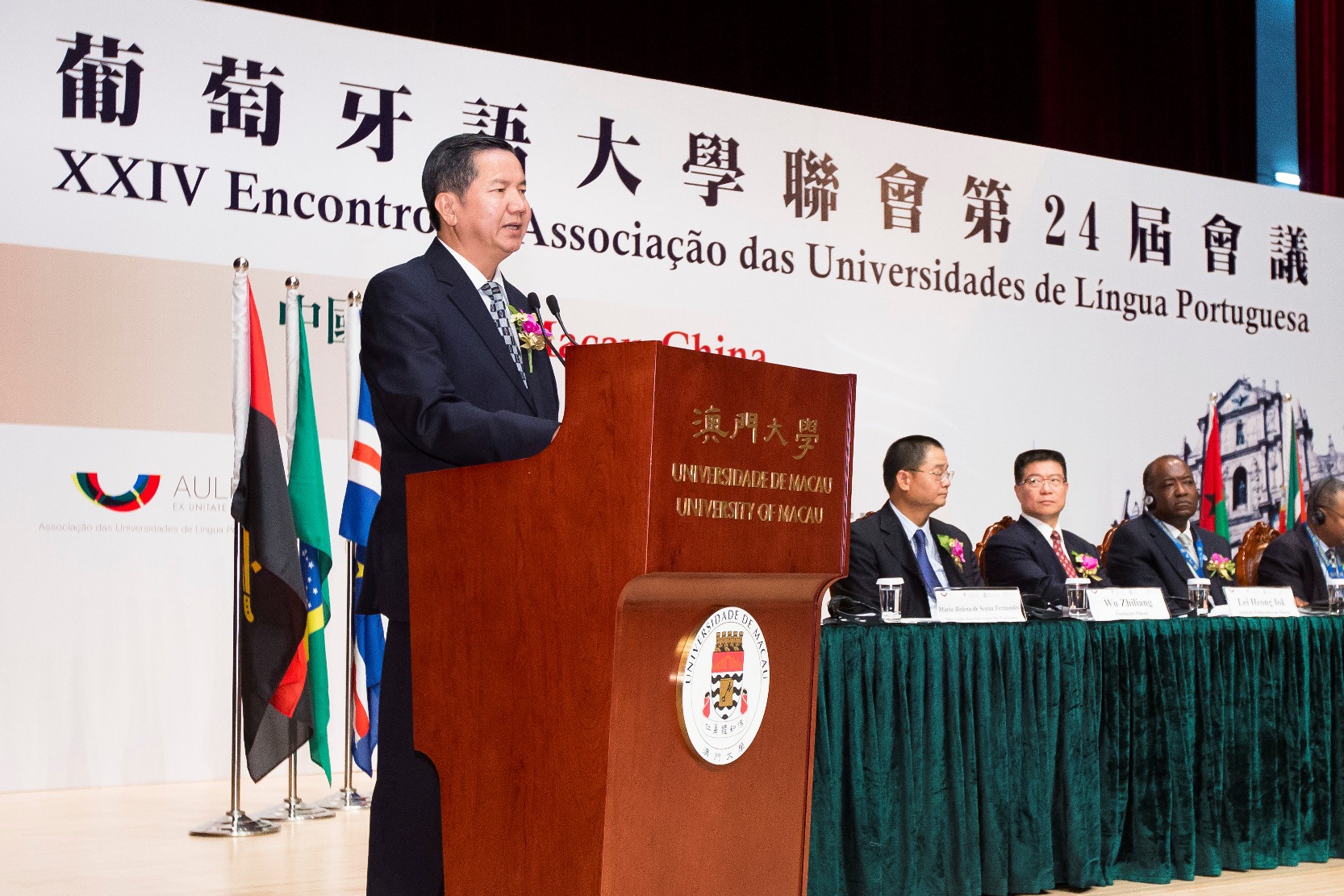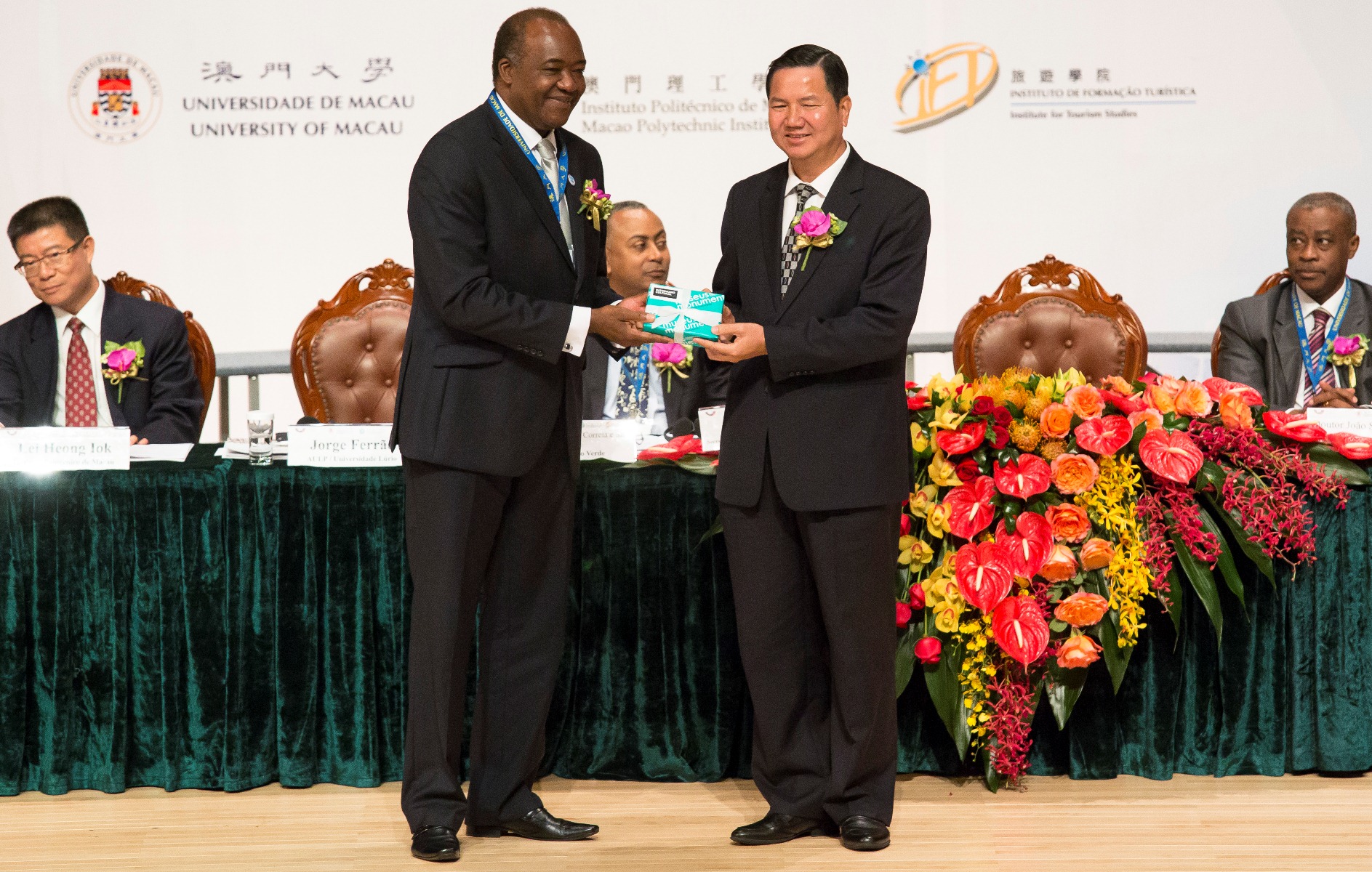 Presidiram à Sessão Solene de Abertura o Secretário para os Assuntos Sociais e Cultura da RAEM, Dr. Cheong U, o Presidente da AULP e Reitor da Universidade Lúrio, Prof. Doutor Jorge Ferrão, o Reitor da UM, Prof. Doutor Wei Zhao, o Presidente do Instituto Politécnico de Macau, Prof. Doutor Lei Heong Iok, Presidente do Instituto de Formação Turística, Prof.a Doutora Fanny Vong, Presidente da Fundação Macau, Doutor Wu Zhiliang, e a Directora da Direcção dos Serviços de Turismo, Dr.a Maria Helena Senna Fernandes.