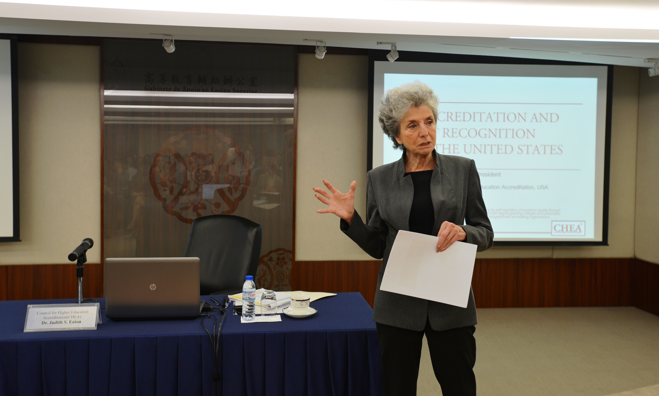 O Gabinete de Apoio ao Ensino Superior convidou, recentemente, a Dra. Judith S. Eaton, presidente do Conselho de Acreditação do Ensino Superior dos Estados Unidos da América (Council for Higher Education Accreditation), para se deslocar a Macau, para apresentar o sistema de garantia de qualidade do ensino superior deste país e partilhar as respectivas experiências com os dirigentes das instituições do ensino superior de Macau e demais pessoal relacionado.