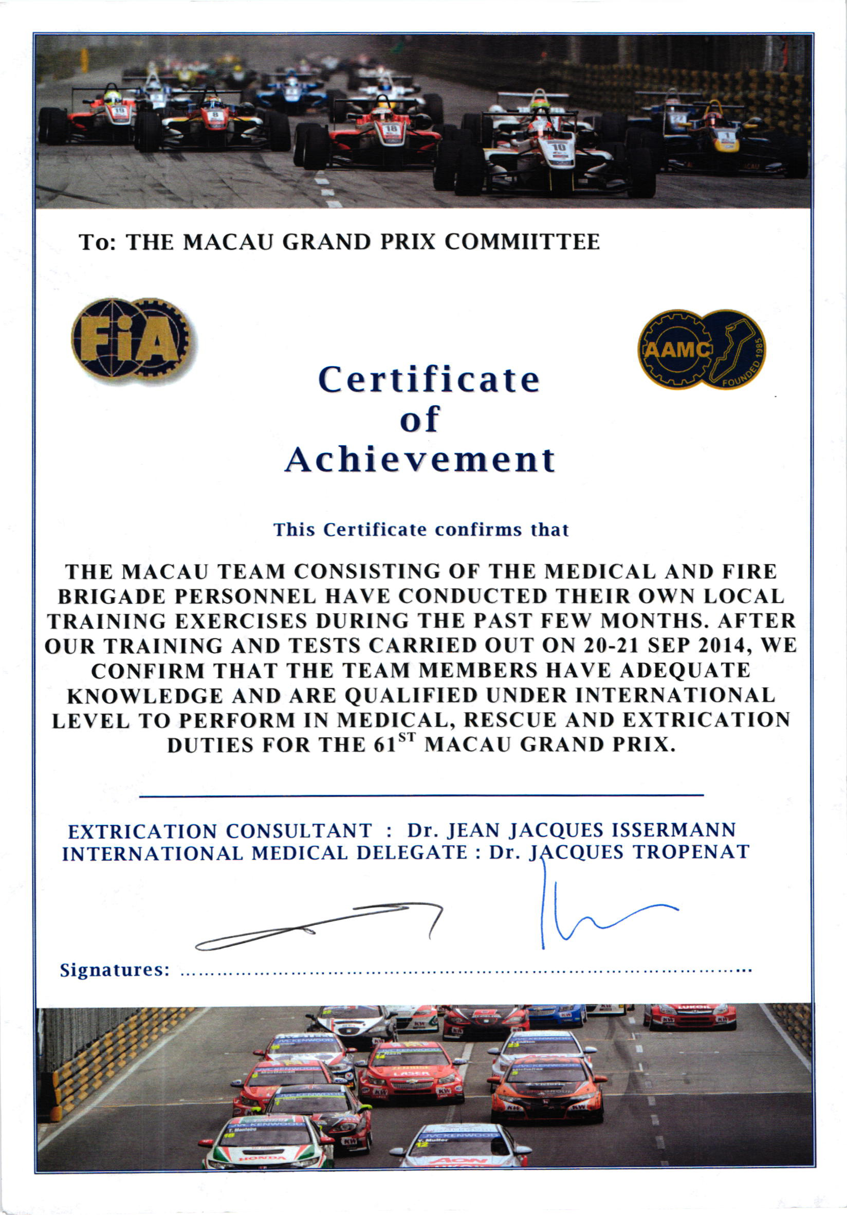 Todos os elementos da Equipa de Intervenção Rápida do Grande Prémio de Macau receberam os respectivos certificados da FIA após o curso de formação e de avaliação. Isto confirma que a Equipa de Intervenção Rápida de Macau alcançou critérios internacionais e garante que cada um dos elementos está munido de conhecimentos e competências para cumprir com os procedimentos de salvamento durante o Grande Prémio.