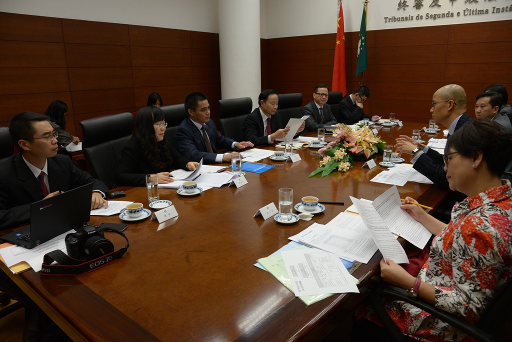 No encontro, o Dr. Sam Hou Fai deu as boas-vindas à delegação chefiada pelo novo presidente do referido Tribunal que se deslocou a Macau para fazer uma visita de observação. Em seguida, o Dr. Sam Hou Fai apresentou à delegação a reforma judiciária após o estabelecimento da RAEM: a primeira reforma é o funcionamento dos Tribunal Judicial de Base e Tribunal de Segunda Instância com juízos especializados, alterando o modo antigo de funcionamento; a segunda é a reforma administrativa e financeira, tendo-se criado o Gabinete do Presidente do Tribunal de Última Instância a fim de prestar apoio administrativo, financeiro e técnico aos tribunais de várias instância, de modo a assegurar o trabalho de julgamento dos juízes; e a terceira é o reforço da gestão dos juízes e funcionários de justiça através da adopção de várias medidas. O Presidente Ao Guangen referiu que esta visita tinha como objectivo ouvir as experiências dos Tribunais de Macau referentes à garantia da justiça e gestão administrativa e financeira no processo da reforma judiciária, que poderão servir de referência para a futura reforma judiciária do Interior da China, apresentando, outrossim, o funcionamento do Tribunal Popular do novo distrito da Ilha de Hengqin da Cidade de Zhuhai. Ambas as partes discutiram profundamente sobre os temas relacionados com o regime de especialização do trabalho de julgamento, a atribuição de processos e a situação da reforma judiciária.