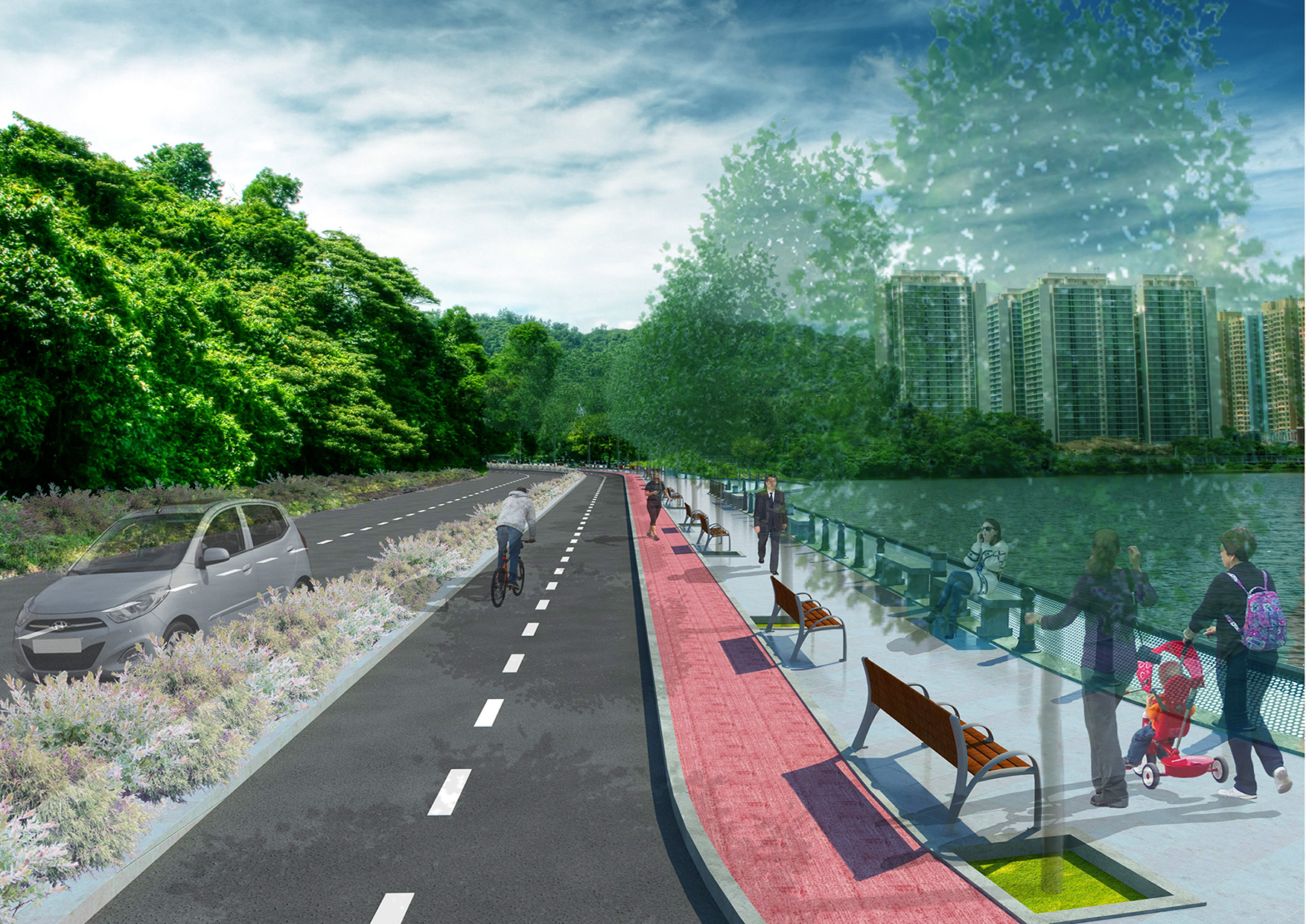No que toca ao espaço entre o novo acesso viário e o reservatório, com a referência do Reservatório da Península de Macau, será executado uma zona de lazer e recreativa polivalente, compreendido sobretudo uma ciclovia cerca de 3,5m de comprimento, com duplo sentido de circulação, passeio, trilho de jogging, parques infantis, zona recreativa ao ar livre, zona de descanso e instalações sanitárias. Após a conclusão, virá ainda em função das necessidades concretas dos moradores articular com os trabalhos do estudo prévio actualmente realizados, se determinadas condições se encontrarem preenchidas, ponderará ampliar a zona de lazer até toda a circunferência do reservatório, o bairro de Seac Pai Van terá então naquela altura uma zona recreativa ao ar livre que pode ser comparado com o espaço para actividades ao ar livre do Reservatório da Península de Macau, com vista a elevar a qualidade de vida dos moradores.