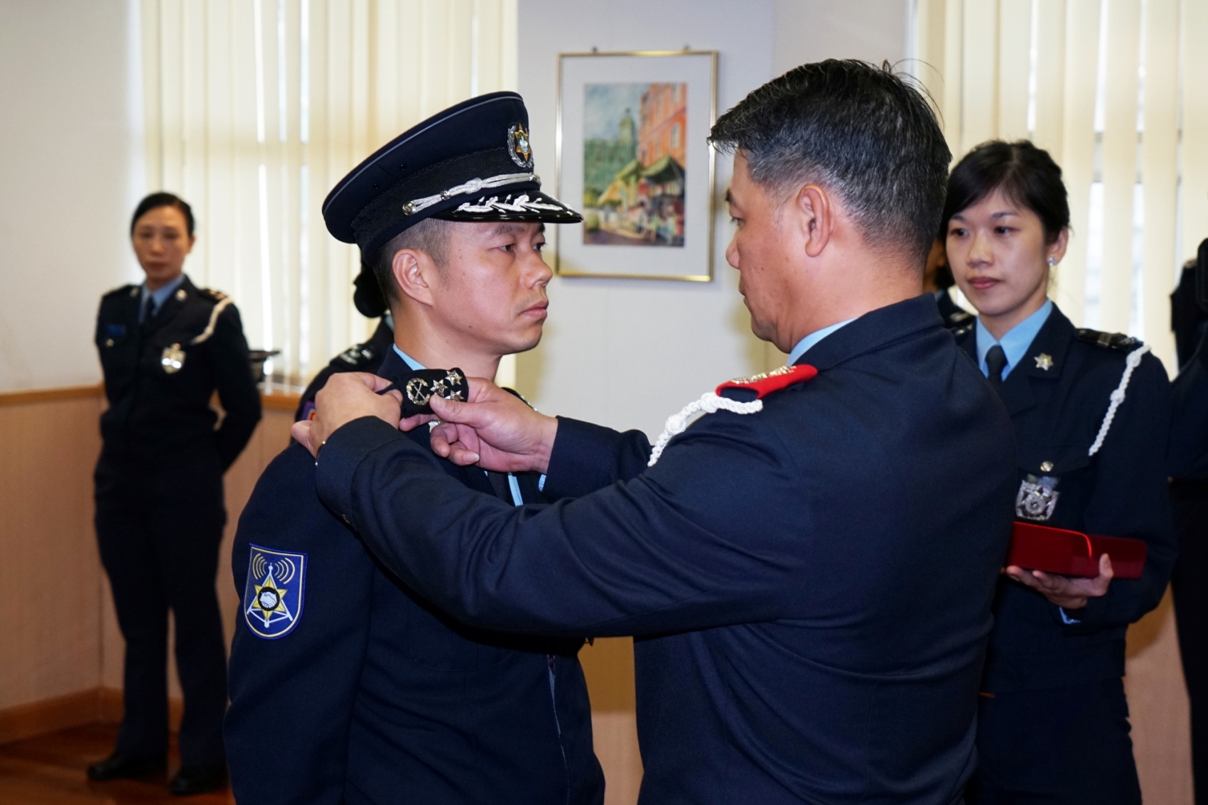 Na referida cerimónia, ao cargo de Intendente vão aceder os dois oficiais,nomeadamente Kwan Kai Veng e Lau Sek Cheong, tendo os dois frequentados No1.° Curso de Formação de Oficiais da Escola Superior das Forças de Segurança de Macau, e concluidos os referidos cursos e acedidos ao cargo de subcomissário em 1995. Posteriormente, ambos desempenharam funções de chefia em vários departamentos desta Polícia. Os dois oficiais superiores têm conhecimentos profissionais e asta experiência no serviço, têm excelente de sempenho e foram, várias vezes promovidos e louvados. Antes de acederem a este cargo, os dois oficiais exerciam, respectivamente, o cargo de Chefe Subst.° do Departamento de Operações e chefe do Gabinete de Ligação dos Serviços de Polícia Unitários..