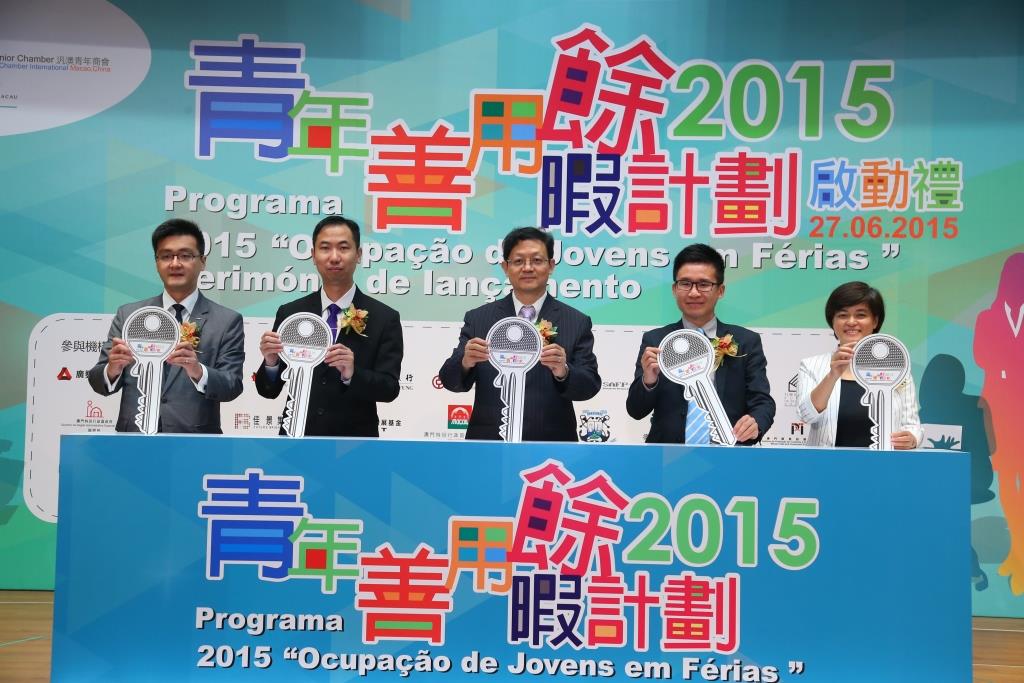 Realizou-se, com sucesso, a cerimónia de lançamento do programa “Ocupação de Jovens em Férias 2015”, no dia 27 de Junho, pelas 15h00, no Centro de Convenções do Centro de Ciência de Macau. O evento, organizado pela Direcção dos Serviços de Educação e Juventude (DSEJ) em colaboração com a Associação de Jovens Empresários Pan Mac, contou com apoio do Centro de Ciência de Macau, S.A., e com a participação conjunta dos serviços públicos e instituições particulares de Macau, tendo em vista a articulação e concretização de uma das linhas de acção governativa da RAEM quanto à “realização de actividades de enriquecimento dos tempos livres” e, em paralelo, o reforço dos trabalhos de aconselhamento de carreira aos jovens.
