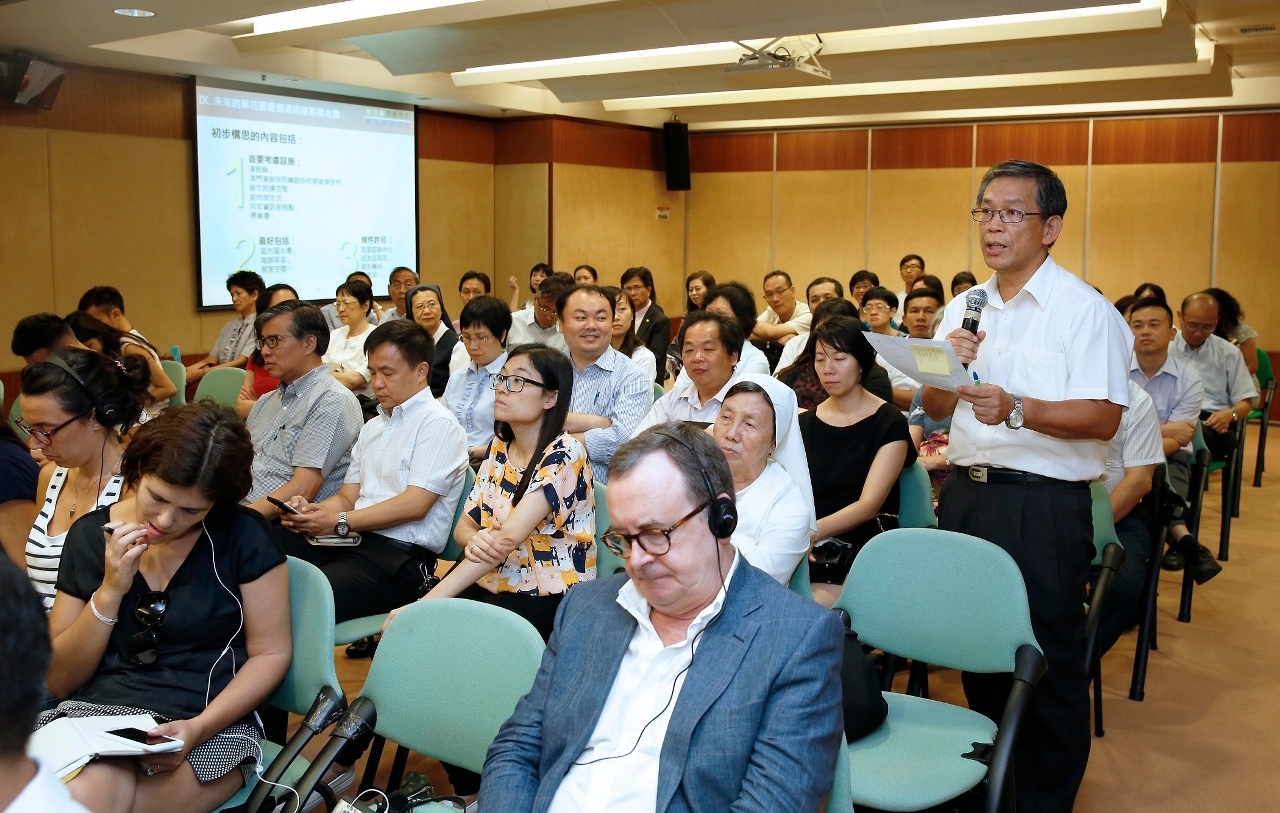 A sessão foi presidida pelo Chefe do Gabinete do Secretário para os Assuntos Sociais e Cultura, Lai Ieng Kit, a directora da DSEJ, Leong Lai, o presidente substituto do ID, Pun Weng Kun e o vice-presidente substituto do IC, Chan Peng Fai, os quais desenvolveram um intercâmbio com os representantes das associações educativas e dirigentes das escolas e ouviram as suas opiniões. Lai Ieng Kit e Chan Peng Fai apresentaram ideias para o reaproveitamento do Antigo Hotel Estoril e Piscina Municipal Estoril, apontando que o hotel em conjunto com as instalações adjacentes, no futuro, será reconvertido para um complexo com elementos de arte, indústrias criativas, educativos, culturais, desportivos, recreativos e de lazer, estando também incluído o Conservatório de Macau, assim como se irá articular com o património cultural e instalações recreativas e desportivas adjacentes, criando um efeito de sinergia, transformando a zona de Tap Seac num centro de actividades artísticas, culturais, recreativas e desportivas. Em paralelo, surgiu a ideia de transformar a Piscina Municipal Estoril numa piscina de água climatizada; caso exista espaço suficiente, também poderá ser construída uma pista de gelo, tornando-se assim o local num complexo arquitectónico em conjunto com o Hotel Estoril.