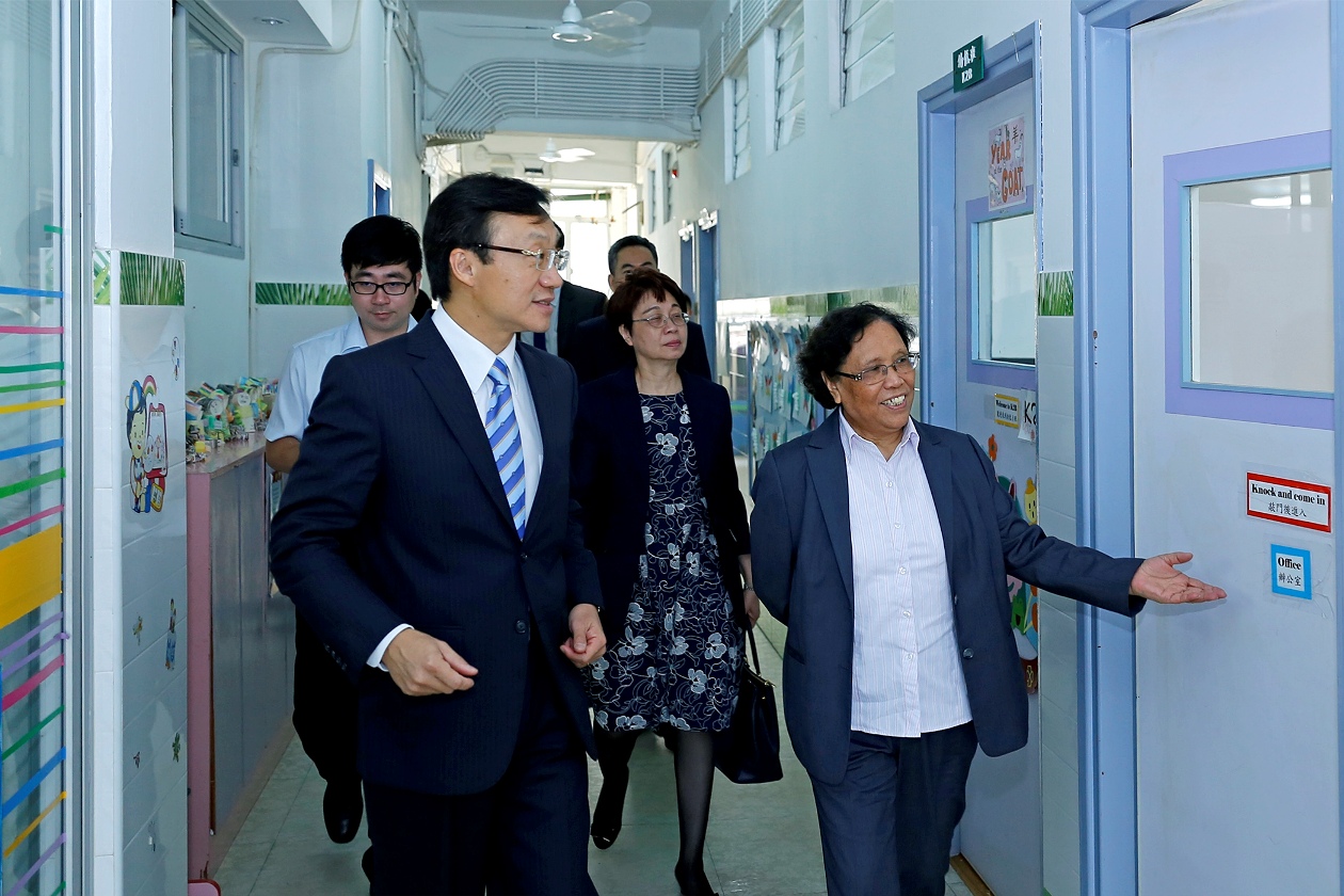 Na visita à Escola Tong Sin Tong, o Secretário foi recebido pelo provedor da Associação de Beneficência Tung Sin Tong de Macau, Chui Sai Cheong, o seu vice-presidente e chanceler Lei Loi tak, o vice-presidente do Conselho Fiscal e chanceler, Eddie Yue Kai Wong e o director, Ao U Hong.