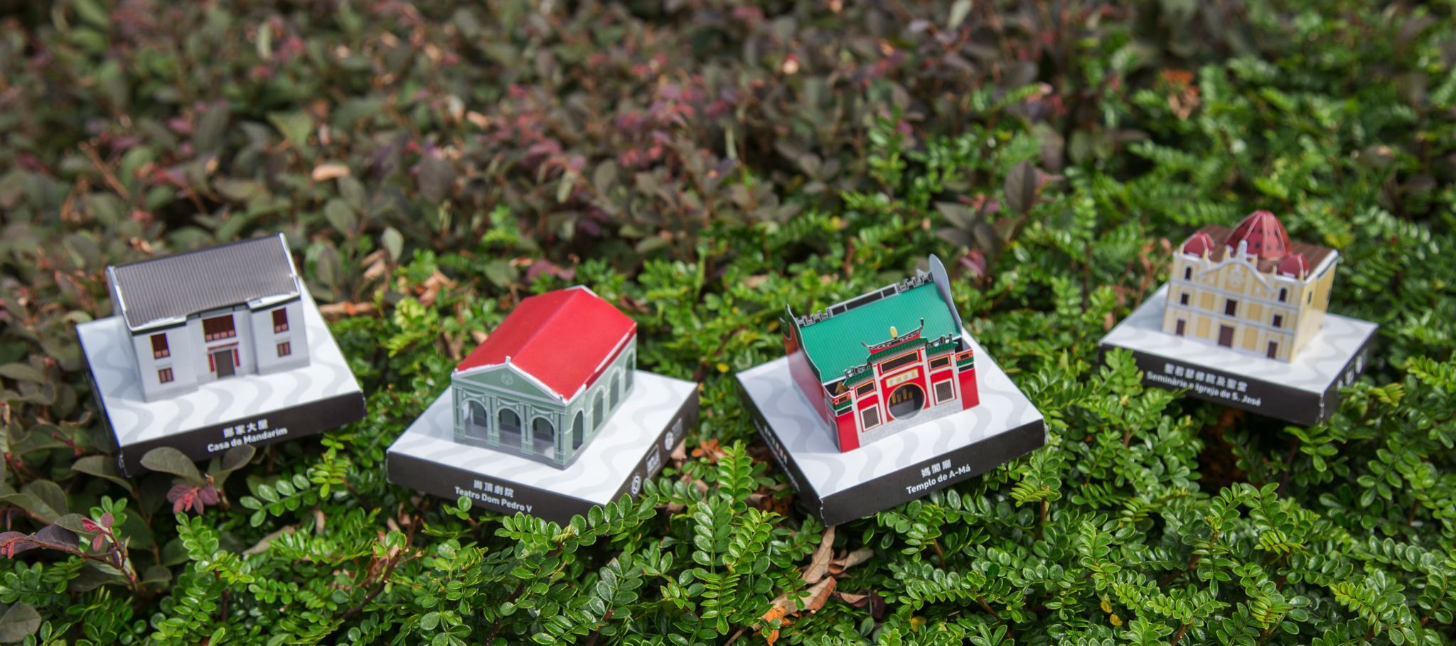O conjunto de quatro modelos tridimensionais em papel de sítios do Património Mundial de Macau representativos inclui: a Igreja e Seminário de S. José, o Teatro Dom Pedro V, a Casa do Mandarim e o Templo de A Má – sobre uma base quadrada que corporiza as características sino-ocidentais e a harmonia arquitectónica de Macau. Ao construírem as miniaturas de edifícios do Património Mundial, os cidadãos poderão aprofundar o seu conhecimento sobre as formas destas estruturas e experimentar a beleza destes edifícios e as características de Macau, onde a cultura oriental se integra e justapõe com a cultura ocidental.