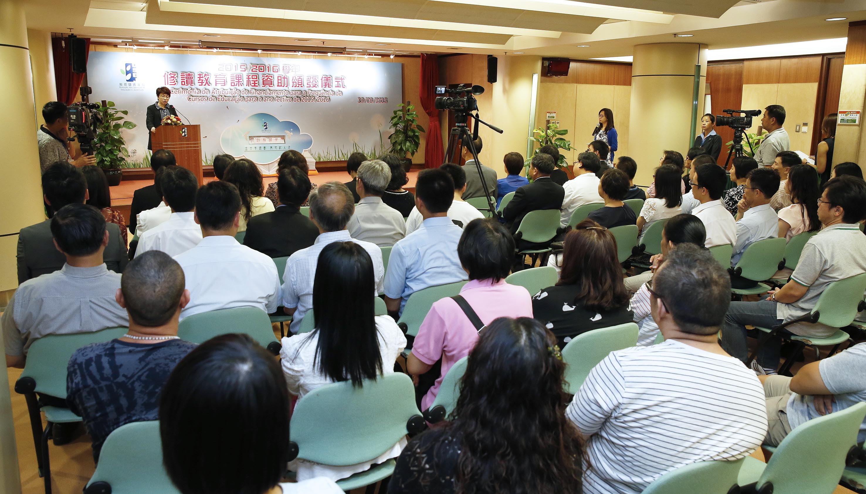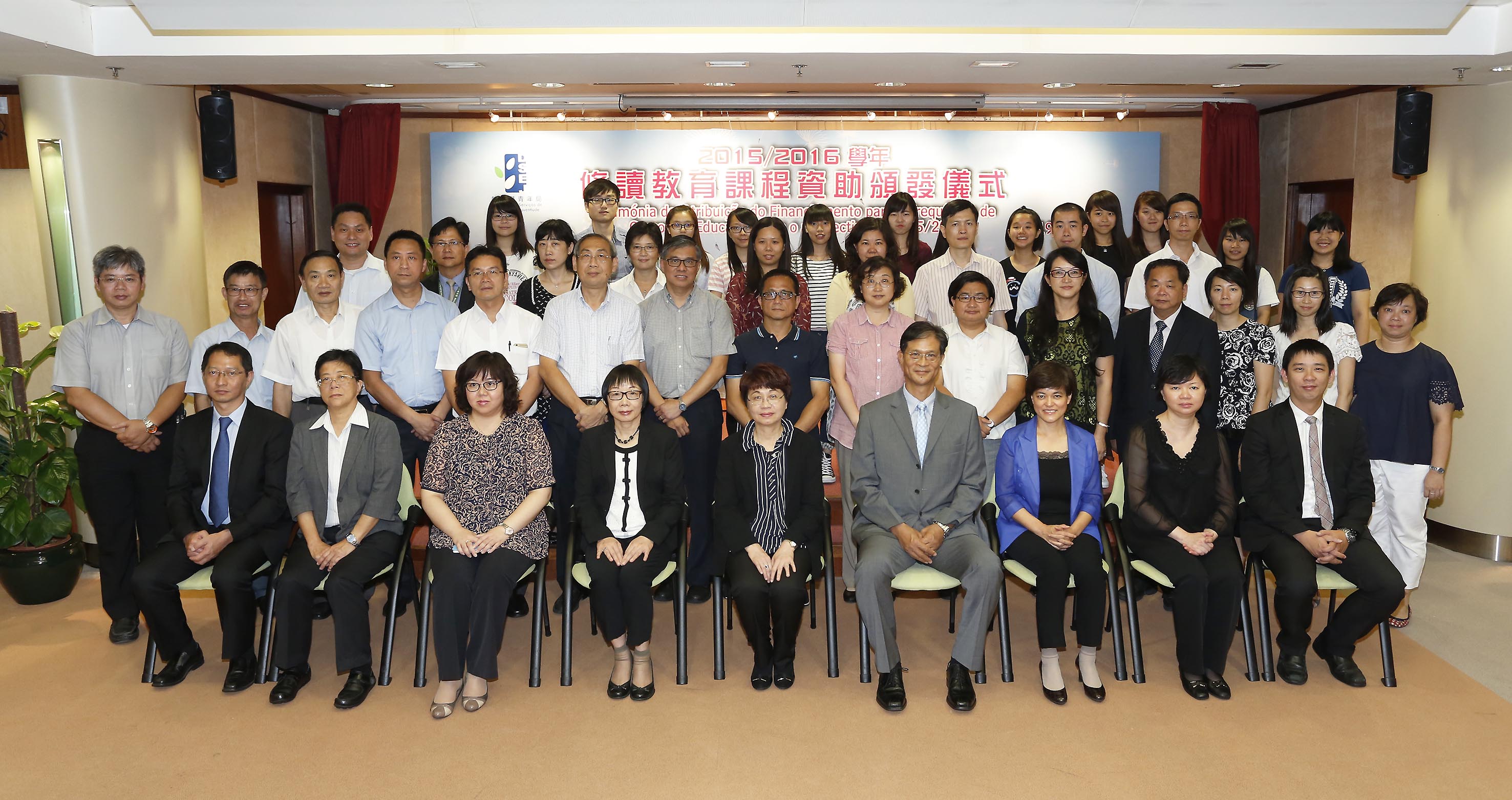 Com o intuito de preparar docentes excelentes e reforçar a criação de um corpo docente de excelência em Macau, a Direcção dos Serviços de Educação e Juventude (DSEJ) continuará a realizar, no ano lectivo de 2015/2016, o “Plano de Financiamento para a Frequência de Cursos de Educação por Alunos Excelentes” e o “Plano de Financiamento para a Frequência de Cursos de Docência de Português e de Línguas”. Neste âmbito e para enaltecer os alunos seleccionados por estes planos, realizou-se a “Cerimónia de Atribuição do Financiamento para a Frequência de Cursos de Educação do Ano Lectivo de 2015/2016”, no dia 19 de Agosto, que contou com a presença da directora da DSEJ, Leong Lai, do assessor do Gabinete do Secretário para os Assuntos Sociais e Cultura, Wai Cheng Iong, da subdirectora da DSEJ, Kuok Sio Lai, dos chefes das subunidades responsáveis e dos directores e responsáveis das escolas secundárias dos alunos finalistas seleccionados, bem como dos encarregados de educação destes alunos, para partilharem, em conjunto, a alegria dos alunos seleccionados.