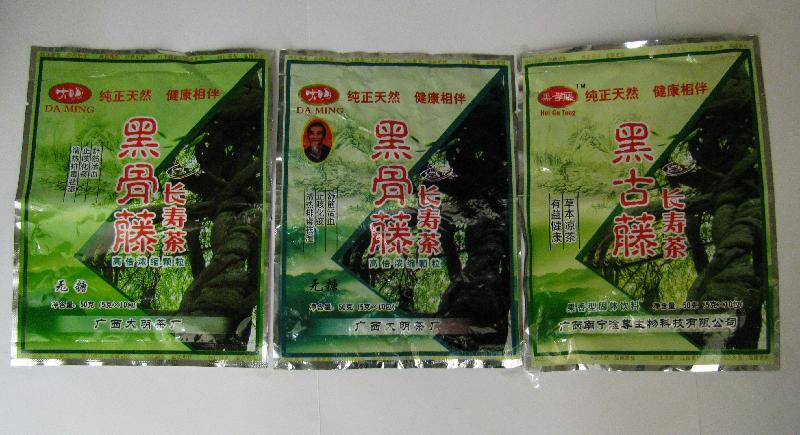 Os Serviços de Saude alertam os consumidores de Macau para que cessem o consumo de dois produtos denominados “大明黑骨藤長壽茶” e “黑古藤長壽茶” (não há nome em português ou inglês, ver a foto em anexo) pelo facto destes produtos possuírem substâncias proibidas pelos Serviços de Saúde e a sua importação e comercialização não estarem autorizadas na RAEM.