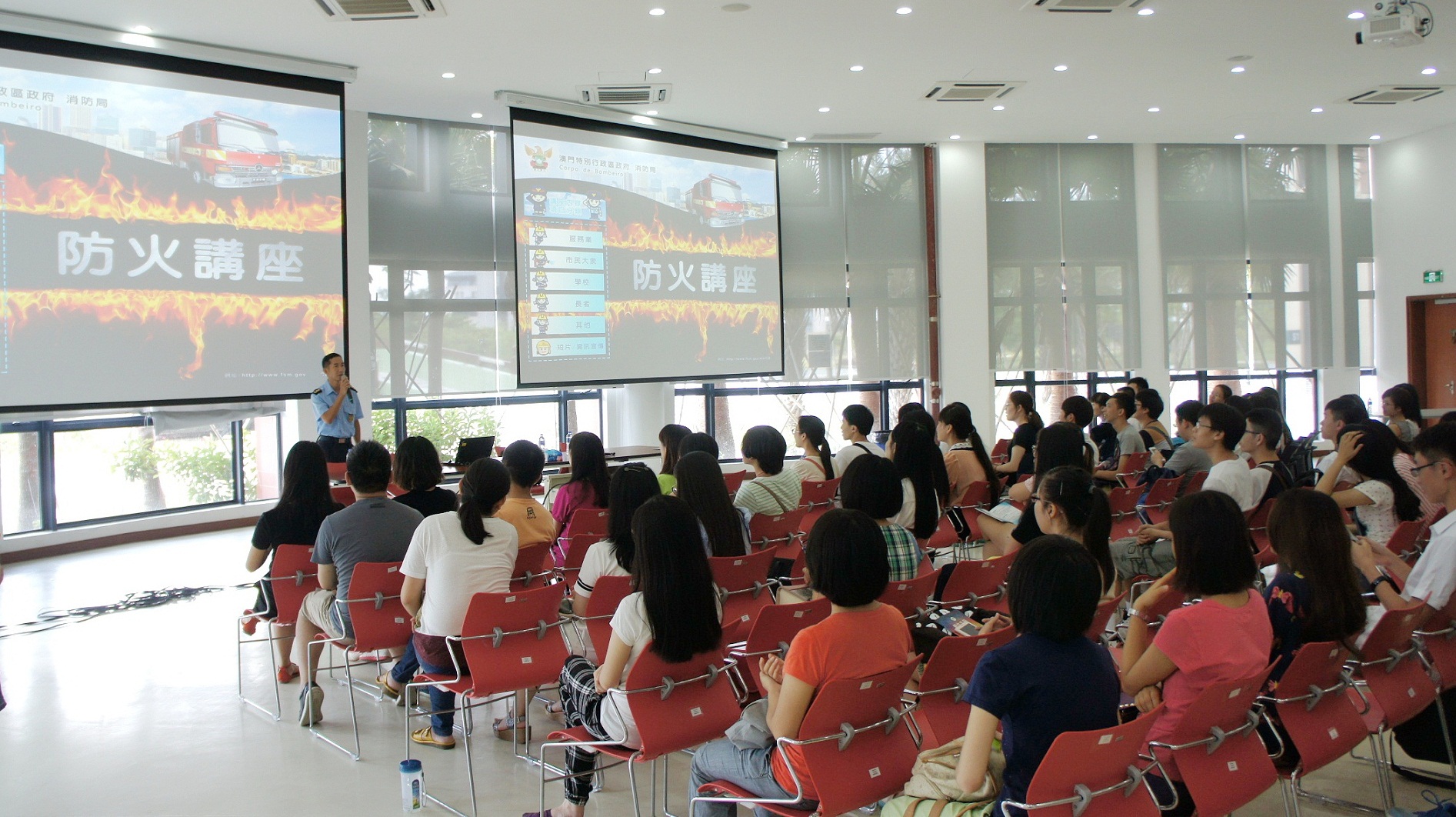 O Corpo de Bombeiros (CB) tem prestado maior atenção à segurança contra incêndios no novo campus da Universidade de Macau (UM). A fim de reforçar a consciência de prevenção, a capacidade de resposta e as técnicas de evacuação dos alunos, docentes e funcionários alojados no campus universitário, realizámos, em colaboração com a UM, uma palestra de conhecimentos sobre a segurança contra incêndios no começo do novo ano lectivo. A palestra que se divide em quatro sessões contou com um total de cerca de 600 participantes.