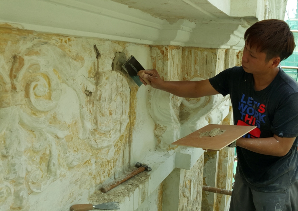 De modo a proceder aos trabalhos de reparação, a equipa do Instituto Cultural realizou, em primeiro lugar, uma análise detalhada ao estado das paredes exteriores, utilizando novos materiais de forma a eliminar os erros do passado revelados por essa análise, como má ventilação, grãos de cimento e tinta de látex com efeitos nocivos à preservação dos tijolos das paredes exteriores. Posteriormente, foi levada a cabo a reparação das paredes exteriores, tendo em conta o desenho e materiais originais, utilizando areia cinzenta que permitirá a ventilação e tintas minerais que permitirão a manutenção estável da cor. Quanto às decorações em barro nas paredes que sofreram com a erosão provocada pela chuva e pelo vento, estas foram, de acordo com o nível de danos sofridos, reparadas usando matérias-primas e técnicas tradicionais; as decorações em risco mas cuja aparência ainda não foi afectada foram reforçadas através da utilização de materiais compatíveis com boa permeabilidade e aderência. Para além da cooperação activa de equipas de engenharia, estes trabalhos receberam ainda a cooperação e apoio activo da escola em questão aos trabalhos do Instituto Cultural.