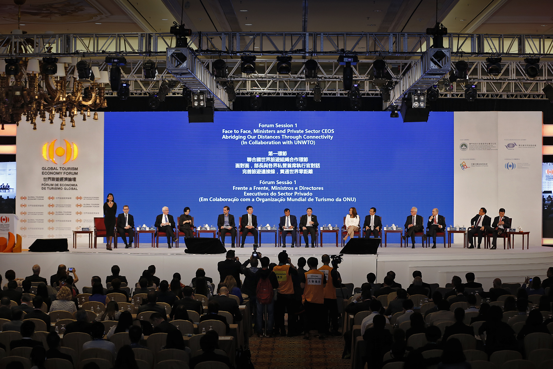 A sessão teve como orador principal, o Secretário-Geral da OMT, Doutor Taleb Rifai, ao qual se juntaram para o debate vários dignitários governamentais, nomeadamente o Ministro do Turismo do Reino do Camboja, Thong Kong, a Vice-Ministra da Indústria, do Comércio e do Turismo da Colômbia, Sandra Howard Taylor, o Vice-Presidente da CNTA, Du Jiang, o Secretário para os Assuntos Sociais e Cultura do Governo da RAEM, Doutor Alexis Tam, o Subsecretário de Coordenação do Ministério de Turismo da Argentina, Alejandro Schiavi, e o Chefe Executivo da Direcção dos Serviços de Turismo do México, Rodolfo López Negrete Coppel, a par com os líderes empresariais: a Directora Executiva da Shun Tak Holdings Limited, Pansy Ho, o Presidente e Director Executivo do Grupo Jumeirah, Gerald Lawless, o Director Executivo do Grupo Kuoni, Peter Meier, o Vice-Presidente do Grupo Fosun, Qian Jiannong, o Presidente do Conselho do Grupo Security, Francisco Silva Silva, e o Presidente do HNA Tourism Group Co. Ltd., Zhang Ling.