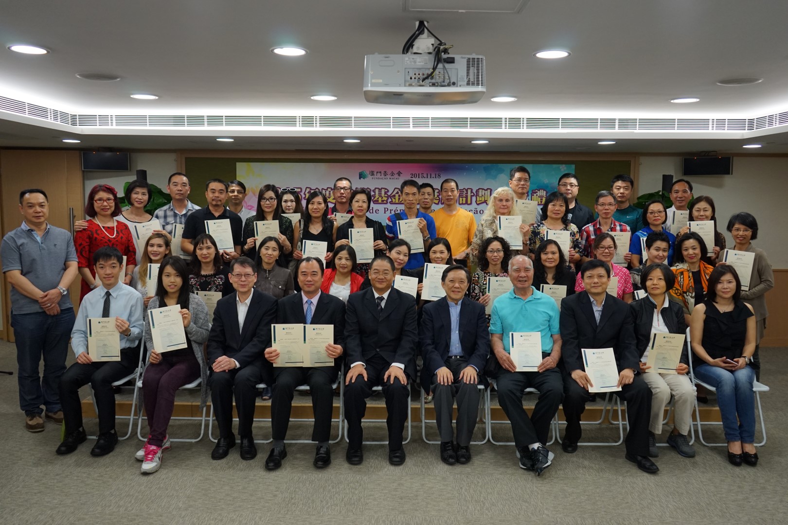 Com vista a reforçar o intercâmbio entre os beneficiários dos prémios e das bolsas de estudo da Fundação Macau, esta Fundação organizou, no passado dia 18 de Novembro, às 18H30, na sede da Fundação Macau, a “Cerimónia de Entrega de Prémios da Fundação Macau, 2015”, na qual participaram os alunos beneficiários da “Bolsa de Mérito Especial” referente ao ano lectivo de 2015/2016 (ou os seus representantes na sua ausência) e as pessoas agraciadas com os “Prémios da Fundação Macau, 2015” que partilharam os seus sentimentos acerca dos seus estudos e dos prémios recebidos, conforme o caso. Estiveram presentes na Cerimónia e em representação da Fundação Macau, o Presidente e outros dois membros do Conselho de Administração, Wu Zhiliang, Au Weng Chi e Lai Chan Keong, respectivamente, que entregaram os certificados a 55 alunos beneficiários da “Bolsa de Mérito Especial” referente ao ano lectivo de 2015/2016 e a 10 unidades agraciadas com os “Prémios da Fundação Macau, 2015”.