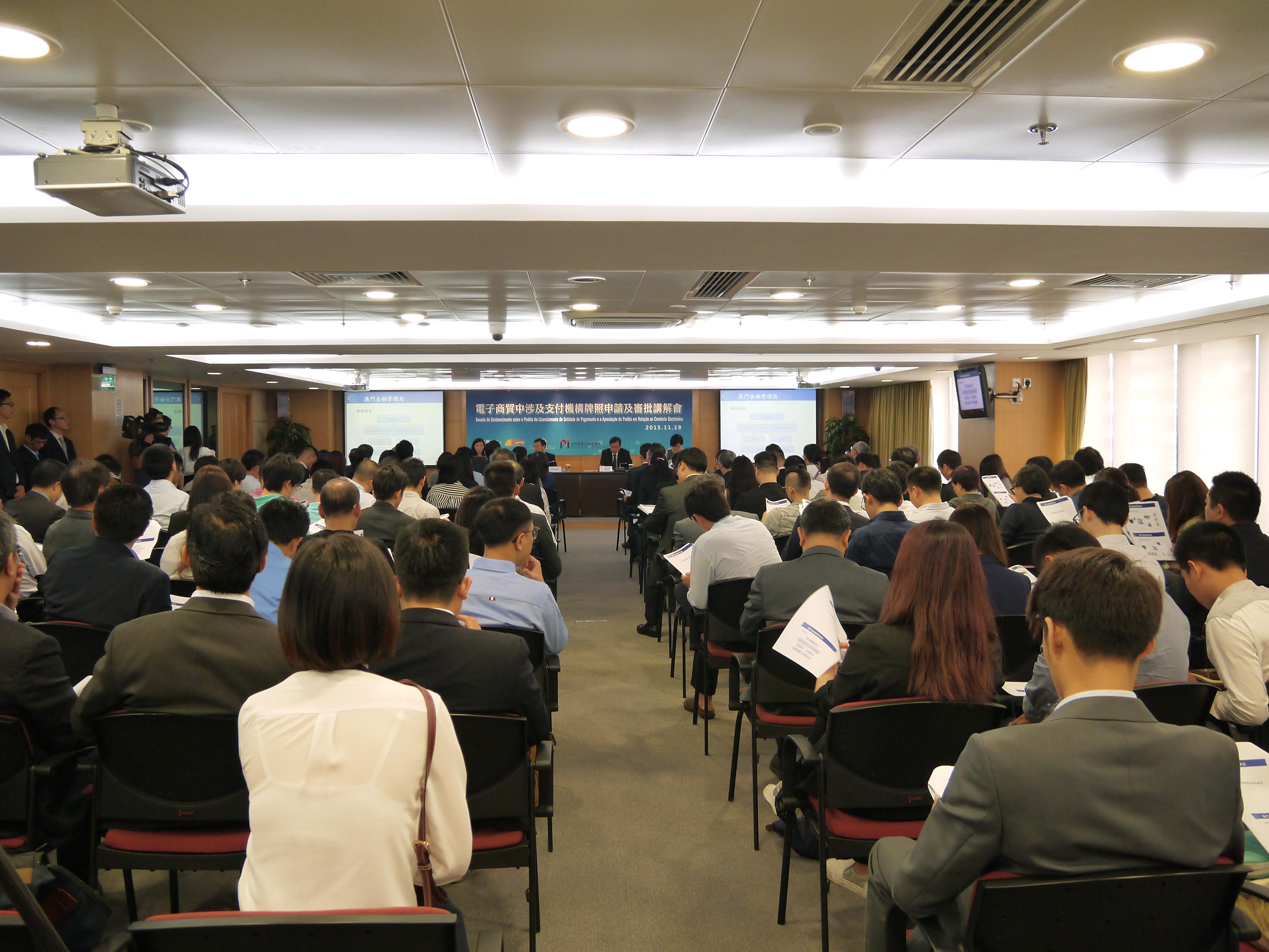 A sessão foi dirigida e explicada pelos representantes da Autoridade Monetária de Macau à cerca do Pedido de Licenciamento de Entidade de Pagamento e a Apreciação do Pedido, tendo, no entanto, esclarecido as diferentes formas de pagamento consideradas pelo sector. Também houve uma profunda troca de opiniões entre os representantes das entidades promotoras e os participantes no meio da sessão.