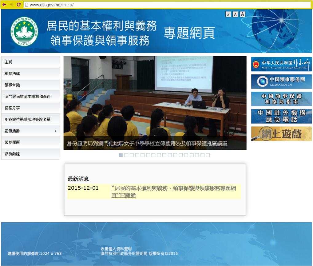A Direcção dos Serviços de Identidicação criou a página electrónica temática, intitulada “Direitos e deveres fundamentais dos residentes e protecção e serviços consulares” (www.dsi.gov.mo/frdcp), a qual entra em funcionamento a partir de 1 de Dezembro de 2015.