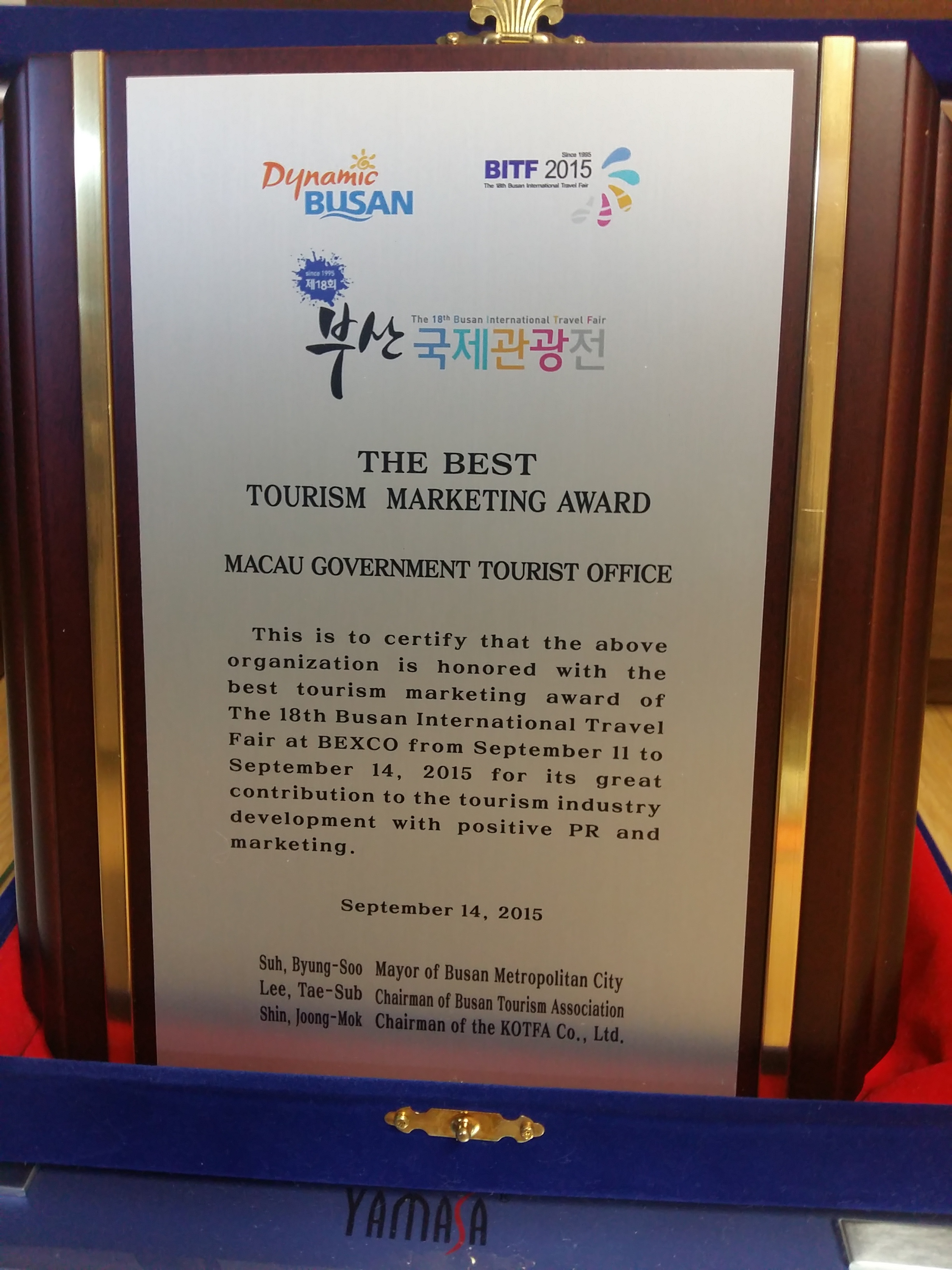 A Direcção dos Serviços de Turismo (DST) procura utilizar formas inovadoras e multimédia diversificadas para promover Macau, tendo o trabalho de promoção do turismo de Macau sido distinguido com vários prémios no ano passado. A DST ganhou o prémio de “Melhor Promoção de Turismo” na 18.ª Feira Internacional de Turismo de Busan na Coreia, bem como o prémio do “Novo Destino de Turismo Mais Popular” na Feira de Viagens ao Exterior da Índia 2015 (India Outbound Travel Market 2015). Por outro lado, a DST foi ainda considerada a “Melhor Entidade Oficial de Turismo” na 26.ª Edição da Cerimónia de Entrega de Prémios da Publicação de Turismo TTG 2015 (TTG Travel Awards 2015).