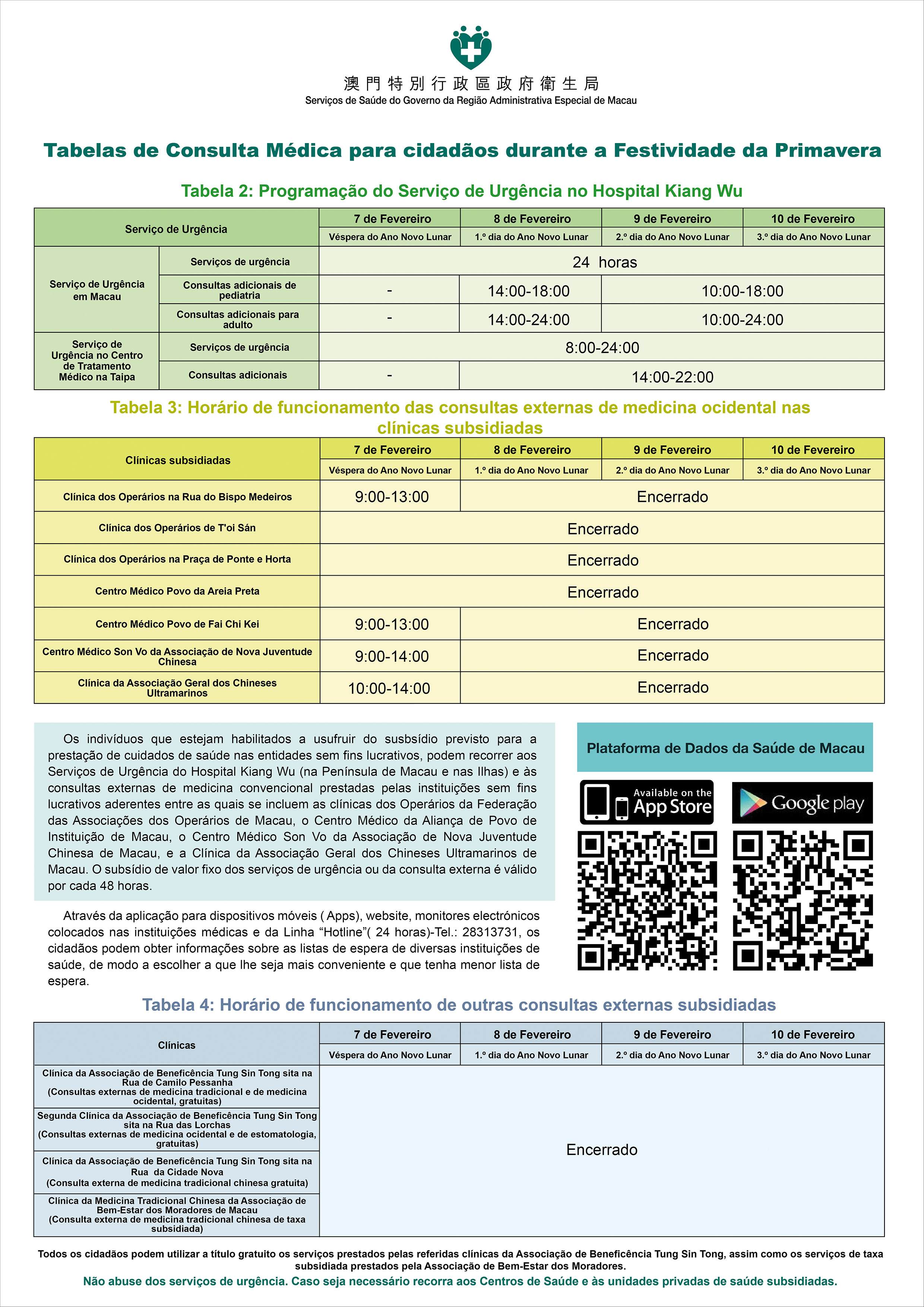 Tendo em conta que os dias de 8 a 10 de Fevereiro (1.o, 2.o e 3.o dia do Novo Ano Lunar Chinês) são dias feriados devido à comemoração do Novo Ano Lunar, os Serviços de Saúde definiram um conjunto de serviços de assistência médica que estarão disponíveis entre 7 e 10 de Fevereiro (Véspera do Novo Ano Lunar Chinês, 1.o, 2.o e 3.o dia do Novo Ano Lunar Chinês):