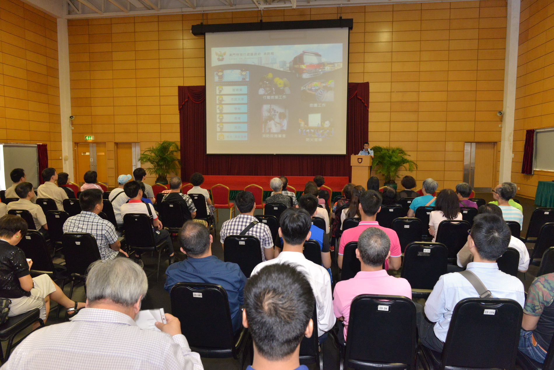 O referido curso teve lugar na manhã do dia 4 de Maio, cujo conteúdo inclui prática do uso de extintores, sarilhos de mangueiras e mangueiras de combate a incêndios, realizada no campo de treino dos bombeiros no aeroporto, na qual o pessoal de administração aprenderam como apagar as pequenas chamas com o extintor. E na parte da tarde, realizou-se no Posto Operacional do Lago Sai Van do CB, uma palestra sobre conhecimentos de segurança contra incêndios, com a participação de cerca de 120 indivíduos, cujo programa engloba: apresentação da nossa missão, valores e visão, teoria da combustão, riscos comuns em incêndios, utilização correcta e segura dos aparelhos de fogão de gás, responsabilidade pela segurança contra incêndios do pessoal de administração predial, medidas de contingência e técnicas de evacuação em caso de incêndios, introdução às instalações e equipamentos contra incêndios, manutenção dos sistemas de protecção e detecção anti-fogo, bem como uso correcto e seguro de extintores, sarilhos de mangueiras e mangueiras de combate a incêndios.