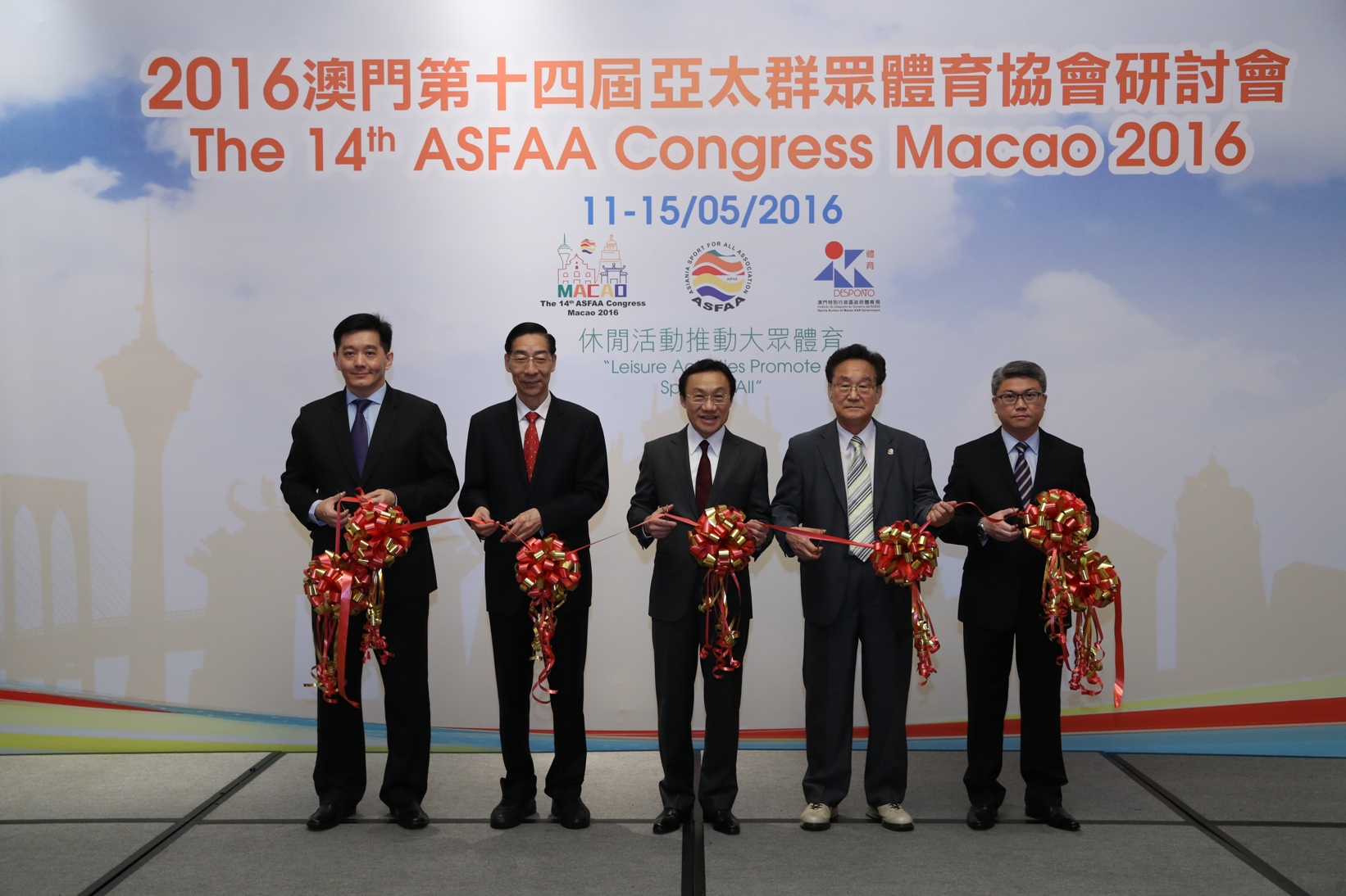 Registou-se, na manhã de 12 de Maio, a Cerimónia de Abertura do 14o Congresso da ASFAA (Asiana Sport for All Association), uma iniciativa organizada pelo Instituto do Desporto, sob a égide da ASFAA. Estiveram presentes na cerimónia de abertura o Secretário para os Assuntos Sociais e Cultura Doutor Alexis, Tam Chon Weng, o Presidente Honorário da ASFAA Feng Jianzhong, o Presidente da TAFISA Ju-Ho Chang, o Presidente da ASFAA Vong Iao Lek, e o Presidente do Instituto do Desporto Pun Weng Kun.