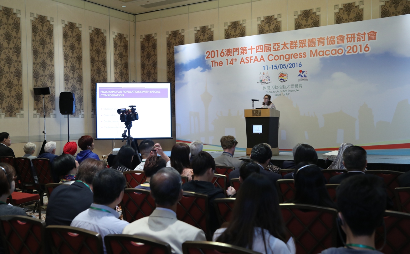 O 14o Congresso da ASFAA que decorre nos dias 11 a 15 de Maio, no Hotel Sheraton Macau, COTAI Central, tem como tema principal “Actividades de lazer como meio de promoção do Desporto para Todos” será orientado por peritos e académicos da China, Hong Kong, Japão, Israel e Portugal, com vista a proporcionar aos participantes informações actualizadas sobre o desenvolvimento do Desporto para Todos.
