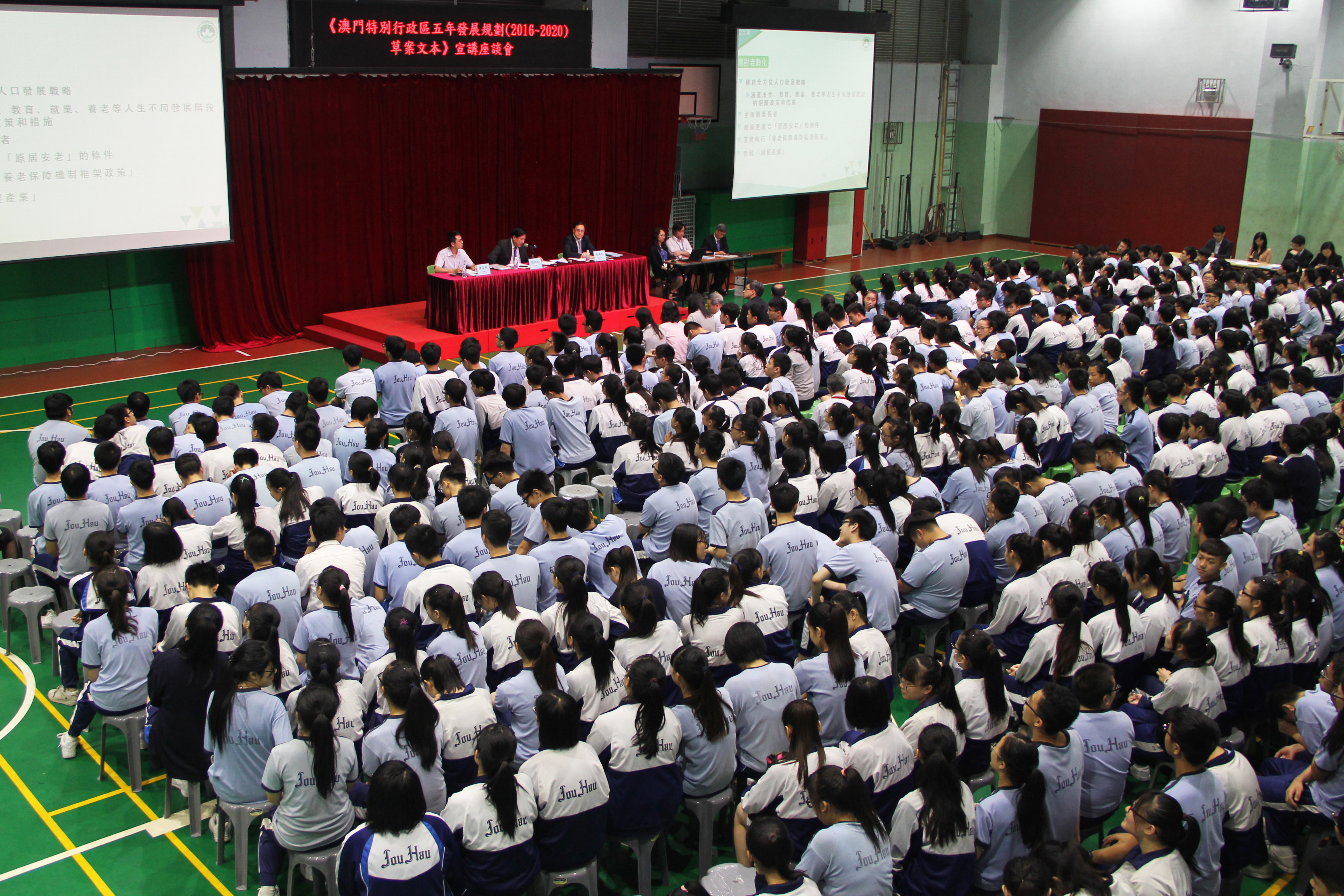 A sessão foi presidida pelo adjunto do director, Chan Ka Keng. No seu discurso, o director, Zheng Jiezhao, referiu que o Plano Quinquenal está estreitamente ligado com o futuro dos estudantes, e apelou para que dessem importância e opinarem de forma activa. O Coordenador do Gabinete de Estudos das Políticas, Lao Pun Lap, apresentou o projecto, dando ênfase ao conteúdo sobre a educação e a formação de talentos, e salientou que um dos objectivos da elaboração do Plano Quinquenal é traçar um quadro de desenvolvimento favorável para a população de Macau em geral, incluindo a camada dos mais jovens, esperando que o plano de desenvolvimento profissional dos jovens e o futuro desenvolvimento de Macau se harmonizem.