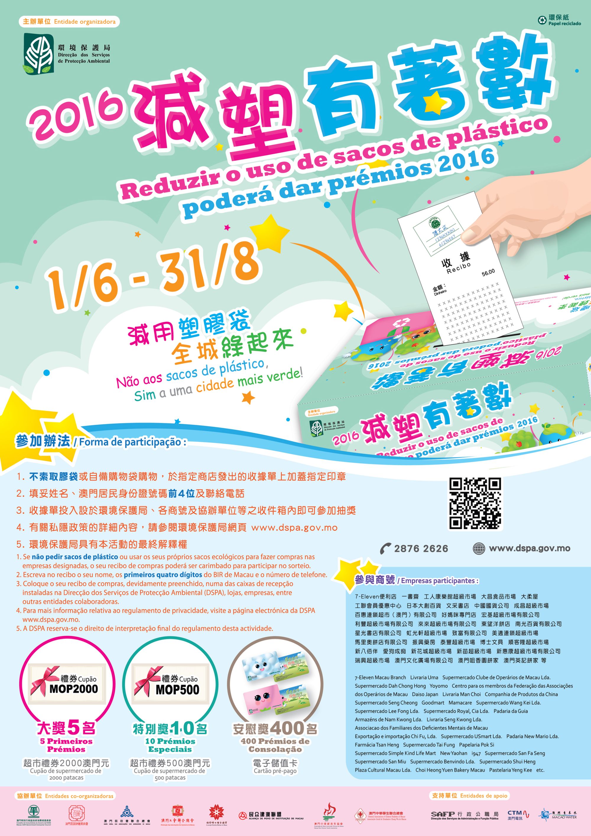 Sendo a “Redução de resíduos a partir da fonte, reciclagem de resíduos recuperáveis” uma parte importante integrante nos trabalhos de protecção ambiental, será disponibilizado o posto de recolha do Programa de Pontos “Verdes” para receber os materiais recicláveis dos cidadãos, podendo os fãs recém-inscritos in situ e os actuais fãs participantes no evento obter 50 pontos (apenas para os residentes de Macau que participem, sendo os pontos atribuídos apenas uma vez). Além disso, motivar os actos de “redução de plástico” ocupa também um lugar importante nos trabalhos de protecção ambiental. Por isso, a DSPA realiza pelo 4º ano consecutivo a actividade intitulada “Reduzir o uso de sacos de plástico poderá dar prémios” e divulga as informações da actividade “Reduzir o uso de sacos de plástico poderá dar prémios 2016” no Festival acima mencionado, isto é, os cidadãos de Macau, durante o período entre 1 de Junho e 31 de Agosto de 2016, poderão participar no grande sorteio, colocando na caixa específica o recibo com o carimbo aposto e os dados pessoais bem preenchidos, na condição de não requerer sacos de plástico ou de usar o seu próprio saco ecológico quando fizer compras nas 35 lojas definidas, as quais possuem cadeias com mais de 210 lojas. Os prémios incluem: 5 primeiros prémios (cupões de supermercado de 2000 patacas), 10 prémios especiais (cupões de supermercado de 500 patacas) e 400 prémios de consolação (cartões pré-pagos com saldo de 100 patacas).