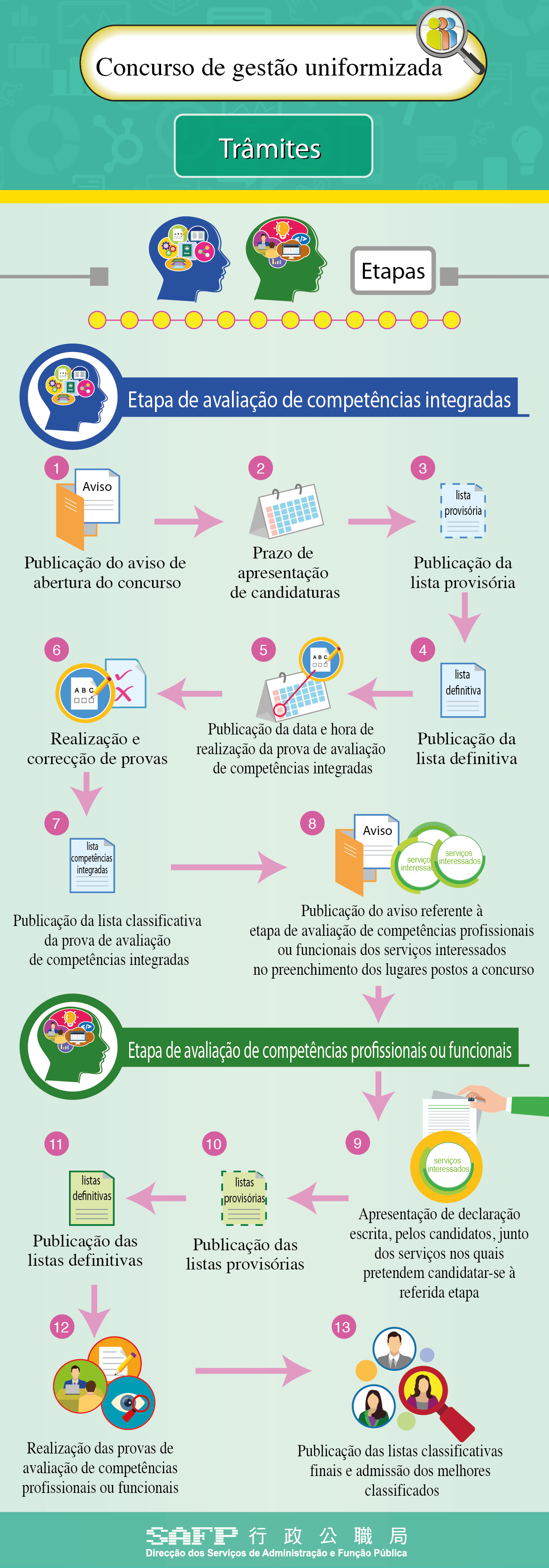 O recrutamento uniformizado consiste em duas etapas: uma etapa de avaliação de competências integradas e uma etapa de avaliação de competências profissionais ou funcionais, aplicáveis às 14 carreiras gerais e às 20 carreiras especiais previstas na Lei n.º 14/2009, prevendo-se, ainda para este ano, a realização da avaliação de competências integradas para os grupos de pessoal técnico superior, técnico de apoio e operário.
