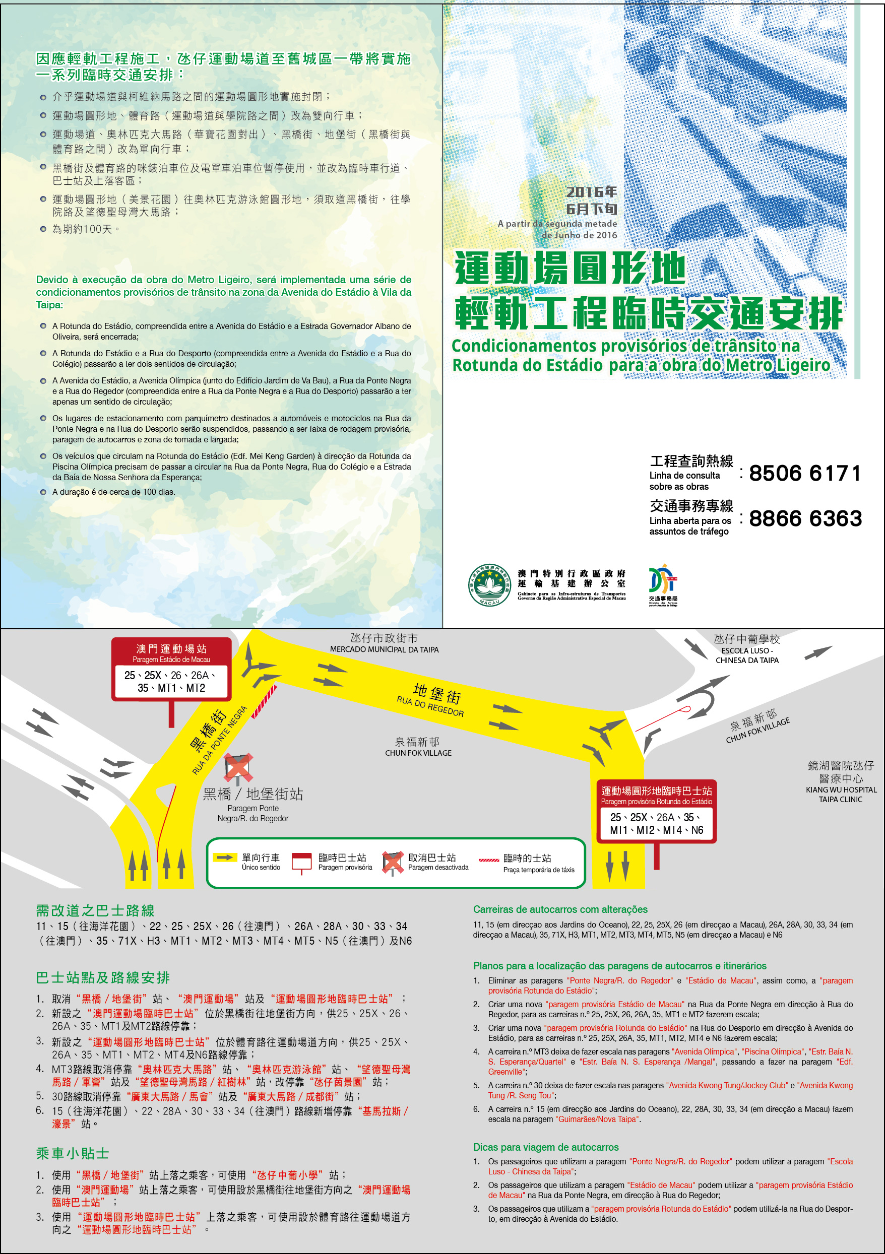 Os dois organismos públicos apelam ao público para prestar atenção aos referidos condicionamentos de trânsito de modo a saírem e planearem o itinerário com antecedência para a sua mobilidade, simultaneamente, respeitar as sinalizações de trânsito instaladas no local e as instruções dos agentes de trânsito. Com vista a permitir os cidadãos a conhecer as obras do Metro Ligeiro e os condicionamentos provisórios de trânsito nos troços acima referidos, os dois organismos públicos elaboraram os folhetos para distribuir ao público, e as respectivas informações encontram-se disponível na página electrónica. Para quaisquer consultas ou opiniões sobre a obra do Metro Ligeiro, os cidadãos podem telefonar para a linha aberta relativa à obra, através do número 8506 6171; e para a linha aberta relativa aos assuntos de tráfego, através do número 8866 6363.