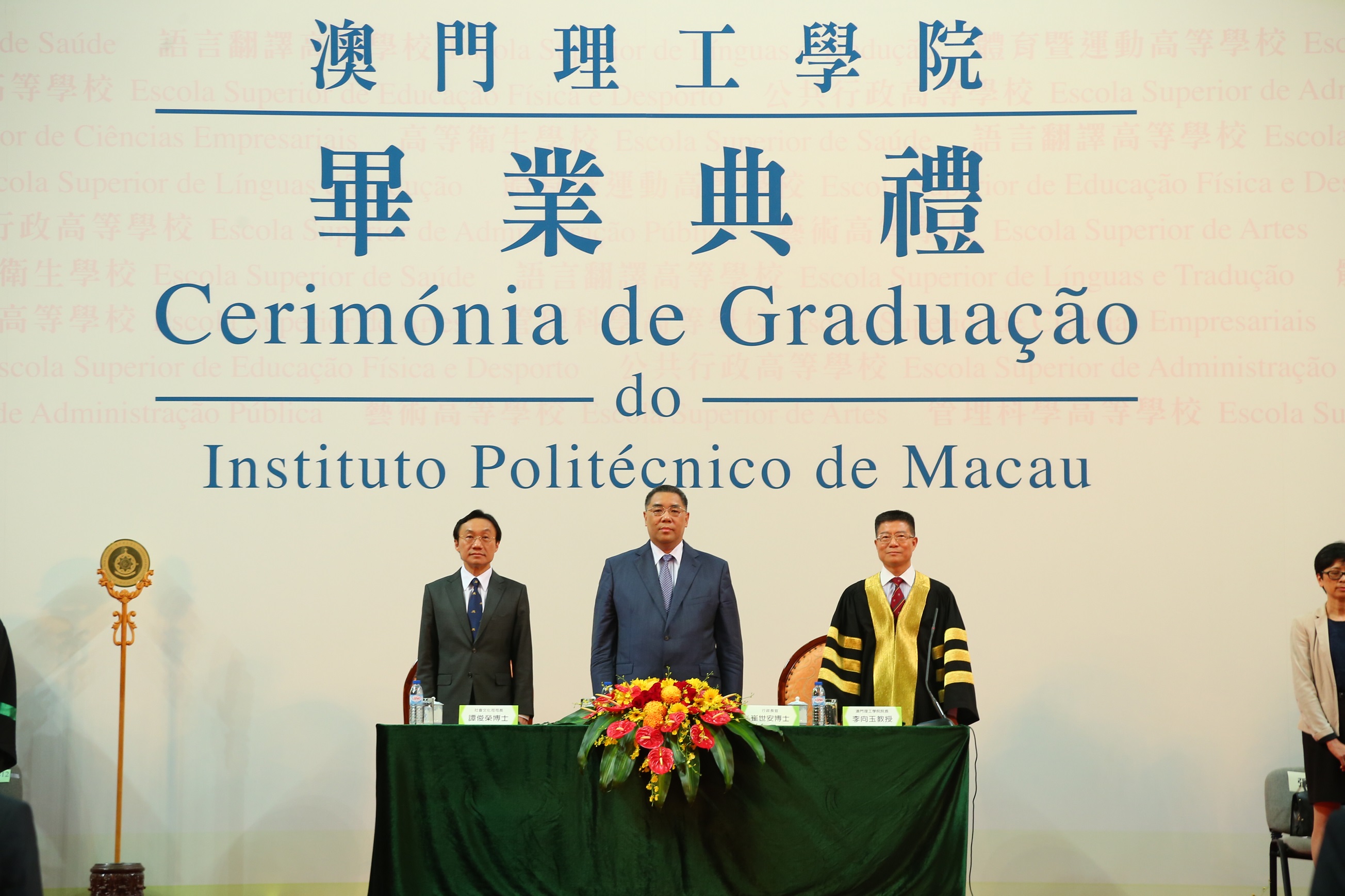 A Cerimónia de Graduação teve lugar no Pavilhão Polidesportivo do IPM, na tarde do dia 28 de Junho, tendo contado com a presença do Chefe do Executivo, Doutor Chui Sai On, do Secretário para os Assuntos Sociais e Cultura, Doutor Alexis Tam Chon Weng, do Sub-director do Gabinete de Ligação do Governo Popular Central da RPC na RAEM, Dr. Sun Da, do Sub-Comissário do Comissariado do Ministério dos Negócios Estrangeiros da RPC na RAEM, Dr. Pan Yundong, do Vice-presidente e de deputados à Assembleia Legislativa de Macau, dos membros do Conselho Consultivo do IPM, de representantes dos serviços públicos e das entidades privadas, de directores das escolas secundárias, bem como de familiares e amigos dos alunos graduados. A Cerimónia decorreu em ambiente participativo e muito caloroso.
