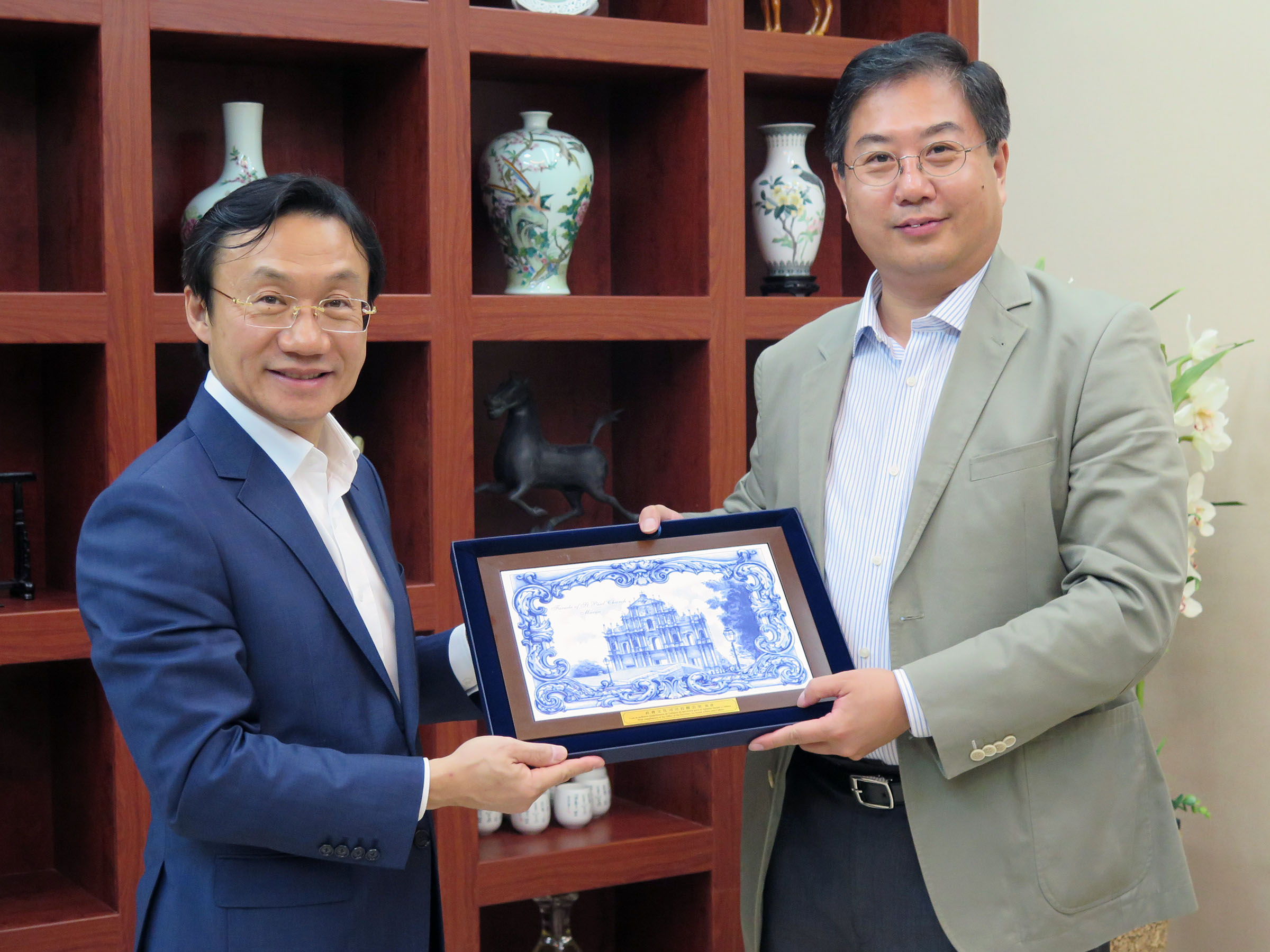 • O Doutor Alexis Tam entrega uma lembrança ao Embaixador Liu Hongyang