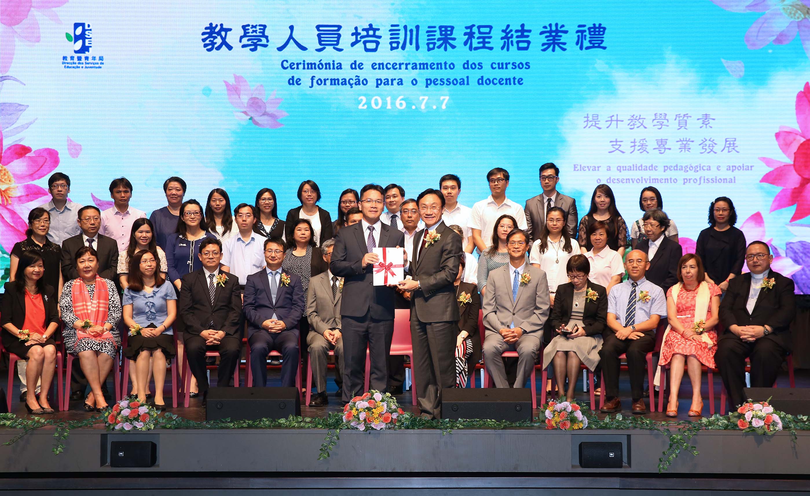 Para partilhar com o pessoal docente os bons resultados e a satisfação alcançada após a conclusão destes cursos e, ao mesmo tempo, incentivar estes profissionais a continuarem os estudos para assim contribuírem para o melhoramento constante da qualidade da educação, a DSEJ realizou a “Cerimónia de encerramento dos cursos de formação para o pessoal docente do ano lectivo de 2015/2016” na tarde do dia 7 de Julho, no Auditório da Escola São Paulo. A referida cerimónia contou com a presença dos seguintes convidados: o Senhor Secretário para os Assuntos Sociais e Cultura, Alexis, Tam Chon Weng, o chefe do Gabinete do Secretário para os Assuntos Sociais e Cultura, Ip Peng Kin, a directora da DSEJ, Leong Lai, o subchefe do Departamento de Cultura e Educação do Gabinete de Ligação do Governo Popular Central na RAEM, Pu Hailong, o assessor do Gabinete do Secretário para os Assuntos Sociais e Cultura, Wai Cheng Iong, os subdirectores da DSEJ, Lou Pak Sang e Kuok Sio Lai, o chefe de secção do Gabinete para os Assuntos de Hong Kong, Macau e Taiwan do Ministério da Educação, Zhang Jun, o director da Faculdade de Educação da Universidade de Macau, Fan Xitao, a directora substituta da Escola Superior de Línguas e Tradução do Instituto Politécnico de Macau, Cui Mingfen, a directora do Departamento de Português da Faculdade de Letras da Universidade de Macau, Maria Fernanda Gil Costa, a presidente da Associação de Educação de Macau, Ho Sio Kam e o presidente da Associação das Escolas Católicas de Macau, Chow Pak Fai, bem como os representantes e formadores das instituições de formação, os directores escolares e mais de 600 docentes que participaram nos cursos.