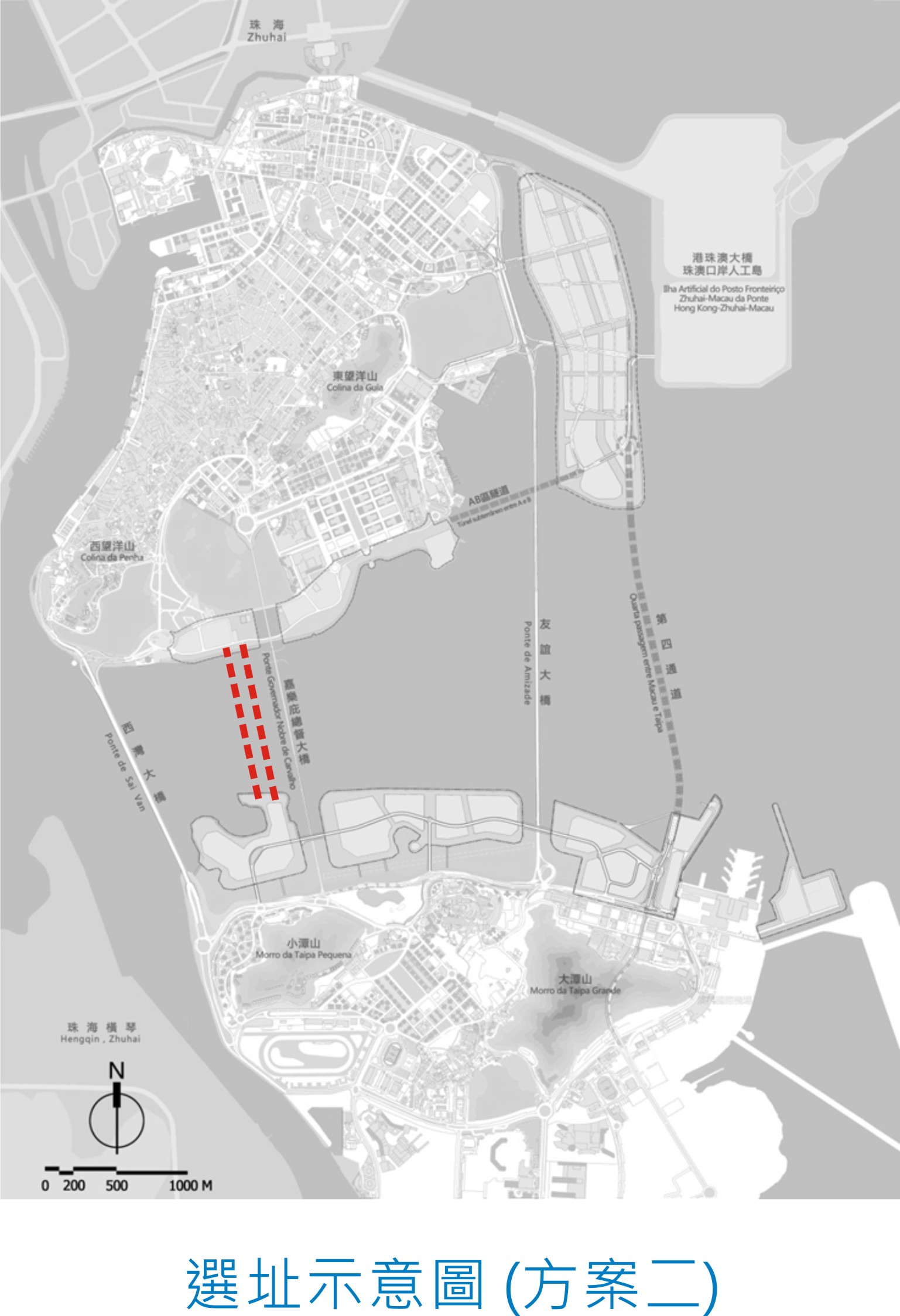 Tendo em consideração de que nesse lugar a distância do mar entre a península de Macau e a ilha da Taipa é mais curta e evitando impactos na Ponte General Nobre de Carvalho e nas paisagens das zonas circundantes, após um estudo preliminar, a DSSOPT acha que é adequada a construção de túneis subaquáticos ao lado da Ponte. Estes túneis ligarão as Zonas C e D dos Novos Aterros Urbanos da Taipa à Zona B dos Novos Aterros Urbanos de Macau. Segundo a estimativa preliminar, cada túnel terá 1 200 metros de comprimento, isto é, metade do comprimento da Ponte General Nobre de Carvalho, e terá, pelo menos, duas faixas de rodagem de sentido único. Um túnel vai em direcção a Macau e outro à Taipa. Há três propostas em relação ao local onde se construirão os túneis, designadamente, nos dois lados da Ponte, no lado oeste da Ponte ou no lado leste da Ponte.