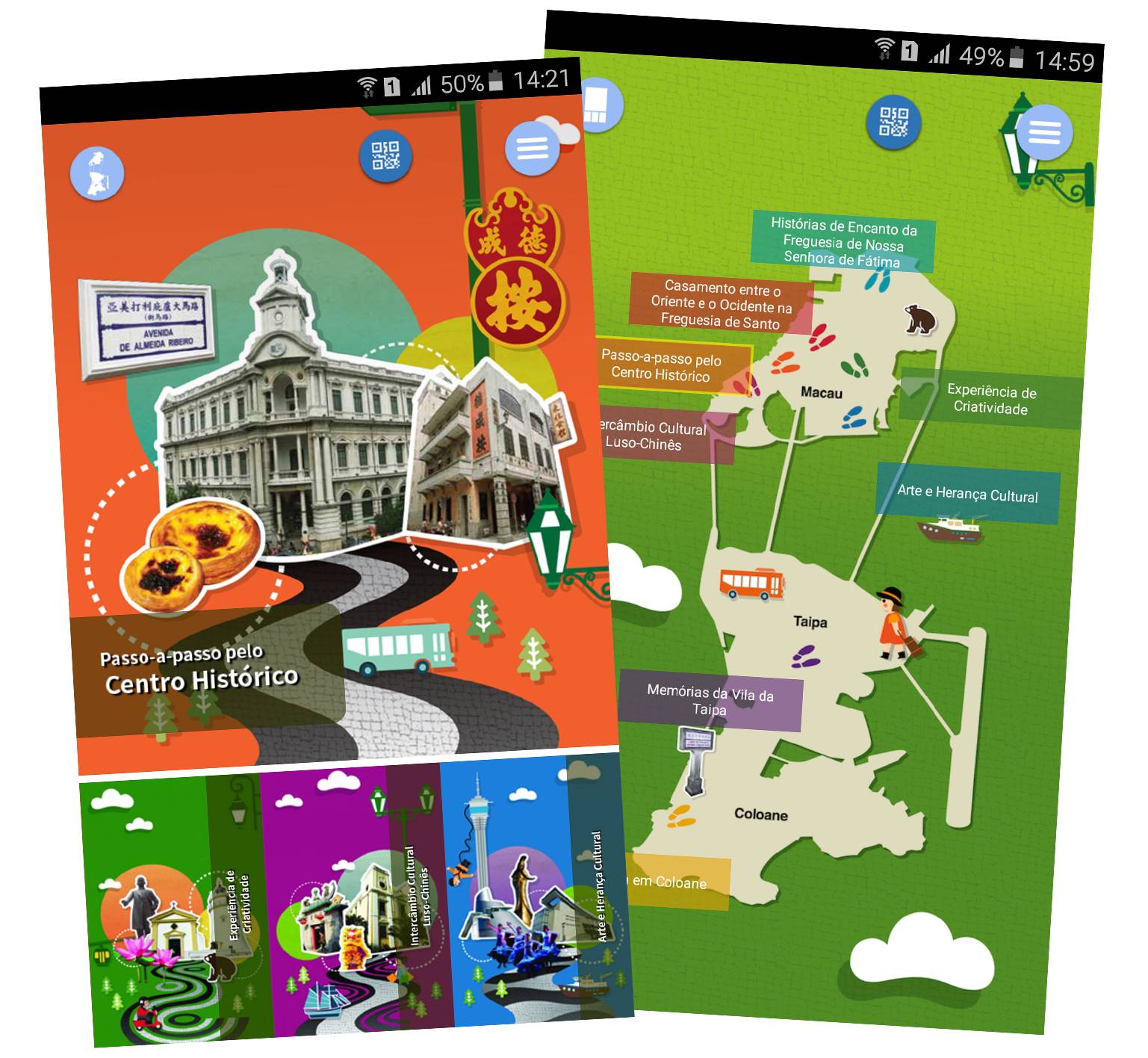 Disponível em chinês (tradicional e simplificado), inglês e português, a aplicação inclui mapas dos oito roteiros, descrições dos pontos turísticos, incluindo do Centro Histórico de Macau inscrito pela UNESCO, espectáculos culturais de rua agendados, restaurantes, carreiras de autocarros, Wi-Fi, casas de banho públicas, e outras informações úteis, ao longo dos roteiros. Os utilizadores também podem fazer o scan de código QR em placas de sinalização ao longo dos roteiros para obter as informações turísticas mesmo offline.