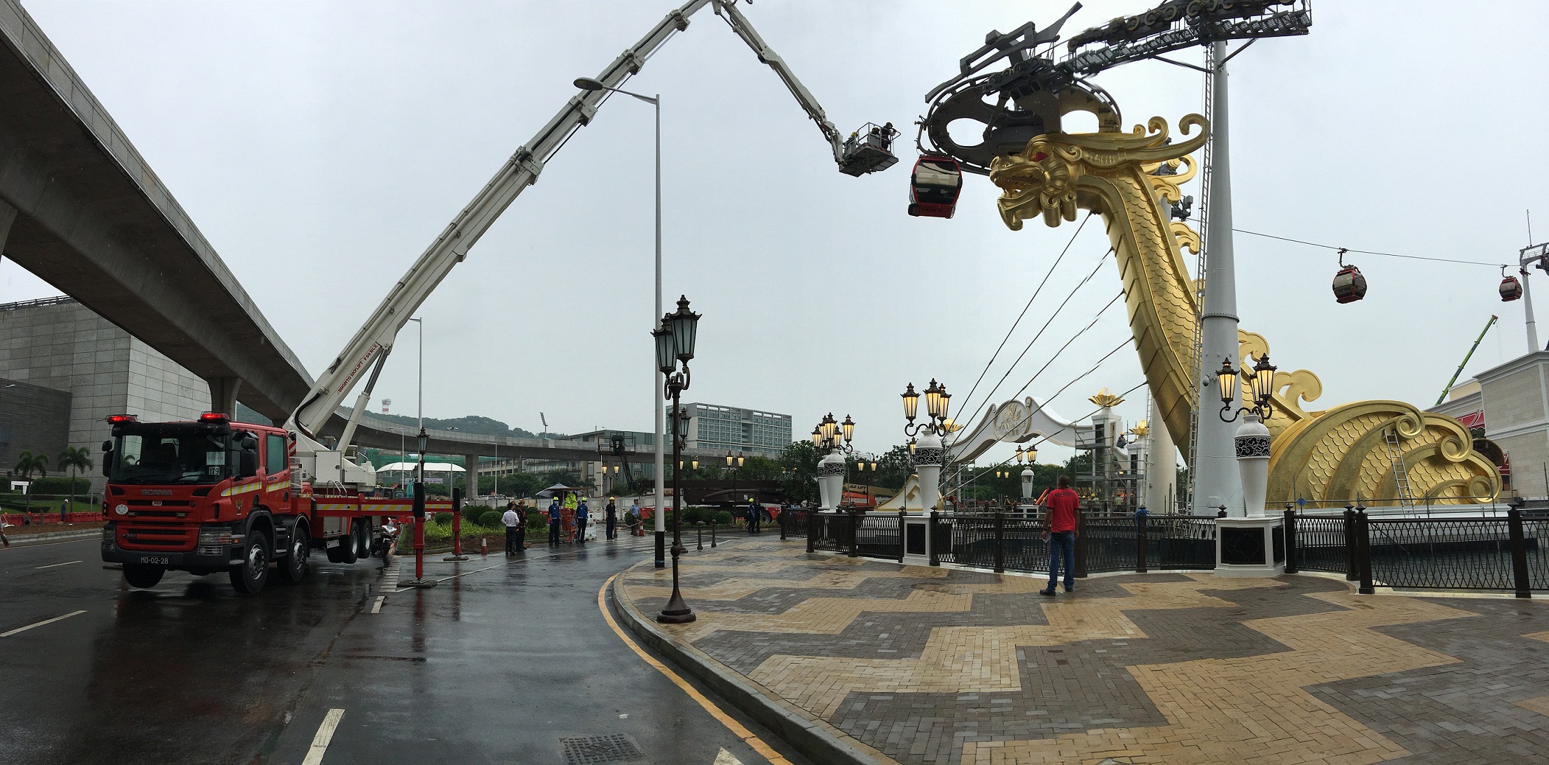 O Corpo de Bombeiros (CB) realizou, hoje (dia 12 de Agosto de 2016), na parte da manhã, em conjunto com o Wynn Palace, um simulacro de salvamento no sistema de teleférico, que serve para testar as medidas de contingência e a coordenação e comunicação entre ambas as partes, em caso de acidentes.