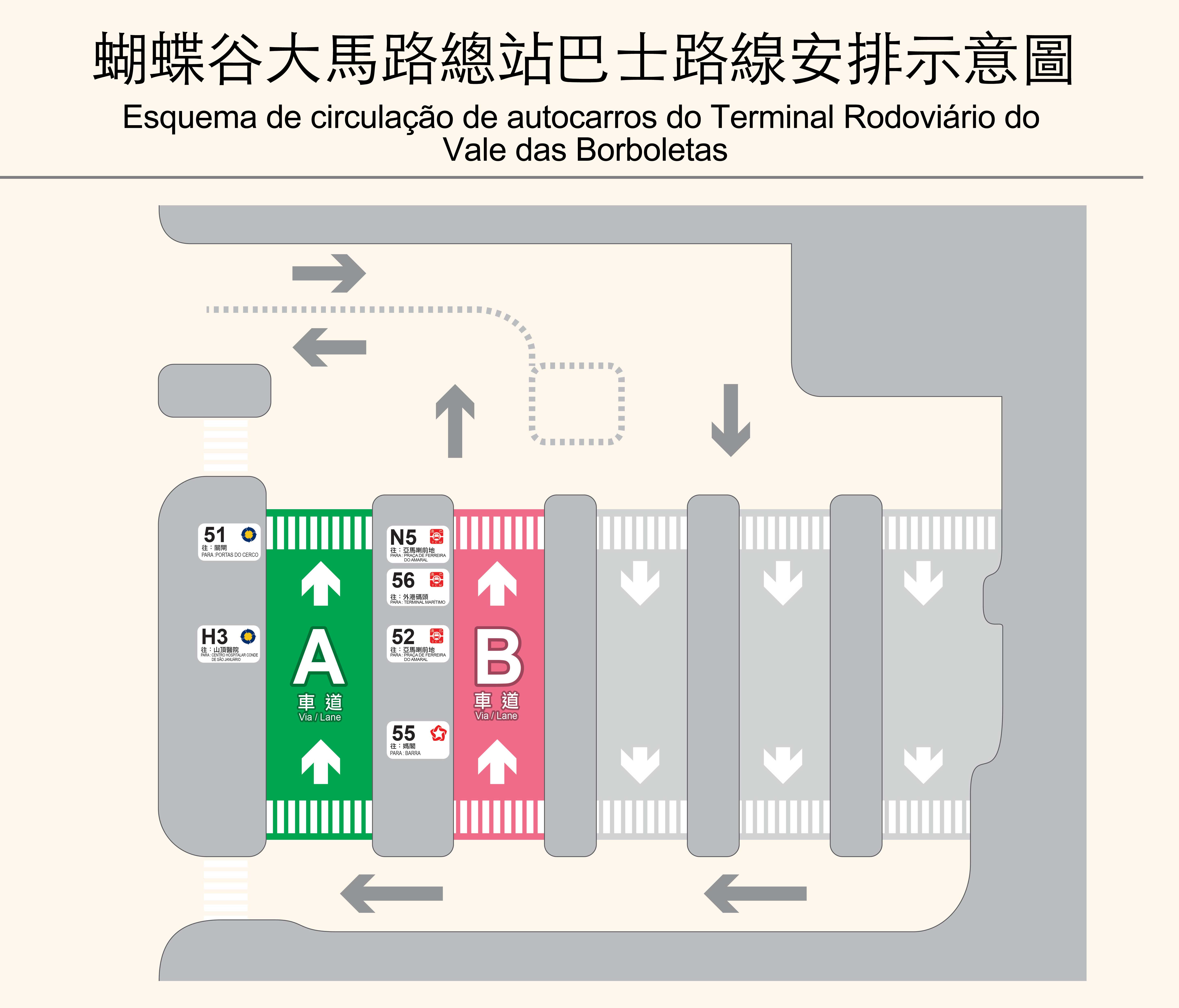 O Terminal do Vale das Borboletas, estabelecido no piso térreo do complexo de habitação pública de Seac Pai Van, dispõe de cinco vias de autocarros, das quais vias A e B são destinadas ao embarque e vias C, D e E servem para desembarque dos passageiros. Na fase actual, o terminal é utilizado como ponto de partida de seis carreiras de autocarros: 51, 52, 55, 56, H3 e N5. No local existem instalações que orientam os passageiros na formação de fila e placas indicativas, para facilitar a espera de autocarros por parte dos passageiros. O terminal provisório que se localizava nos dois lados da Alameda da Harmonia será repartido em duas paragens em que as referidas carreiras continuam a fazer escala, as quais terão respectivamente novas denominações de “Al. da Harmonia / Edf. Ip Heng” e “Al. da Harmonia / Edf. Lok Kuan”. A par disso, as duas paragens na Avenida Lok Koi passam a ser conhecidas, respectivamente, por paragem “Av. de Lok Koi / Edf. Koi Nga” e “Av. de Lok Koi / Edf. Lok Kuan”. Face à entrada em funcionamento do referido terminal, a carreira n.o 55 faz escala na paragem “Al. da Harmonia/Edf. Lok Kuan”, em vez na paragem “Av. de Lok Koi / Edf. Koi Nga”. Para assegurar o bom funcionamento do novo terminal, a DSAT instalou semáforos junto à entrada e saída do mesmo, os quais entram em funcionamento a 19 de Agosto (6.a-feira) às 16h00.