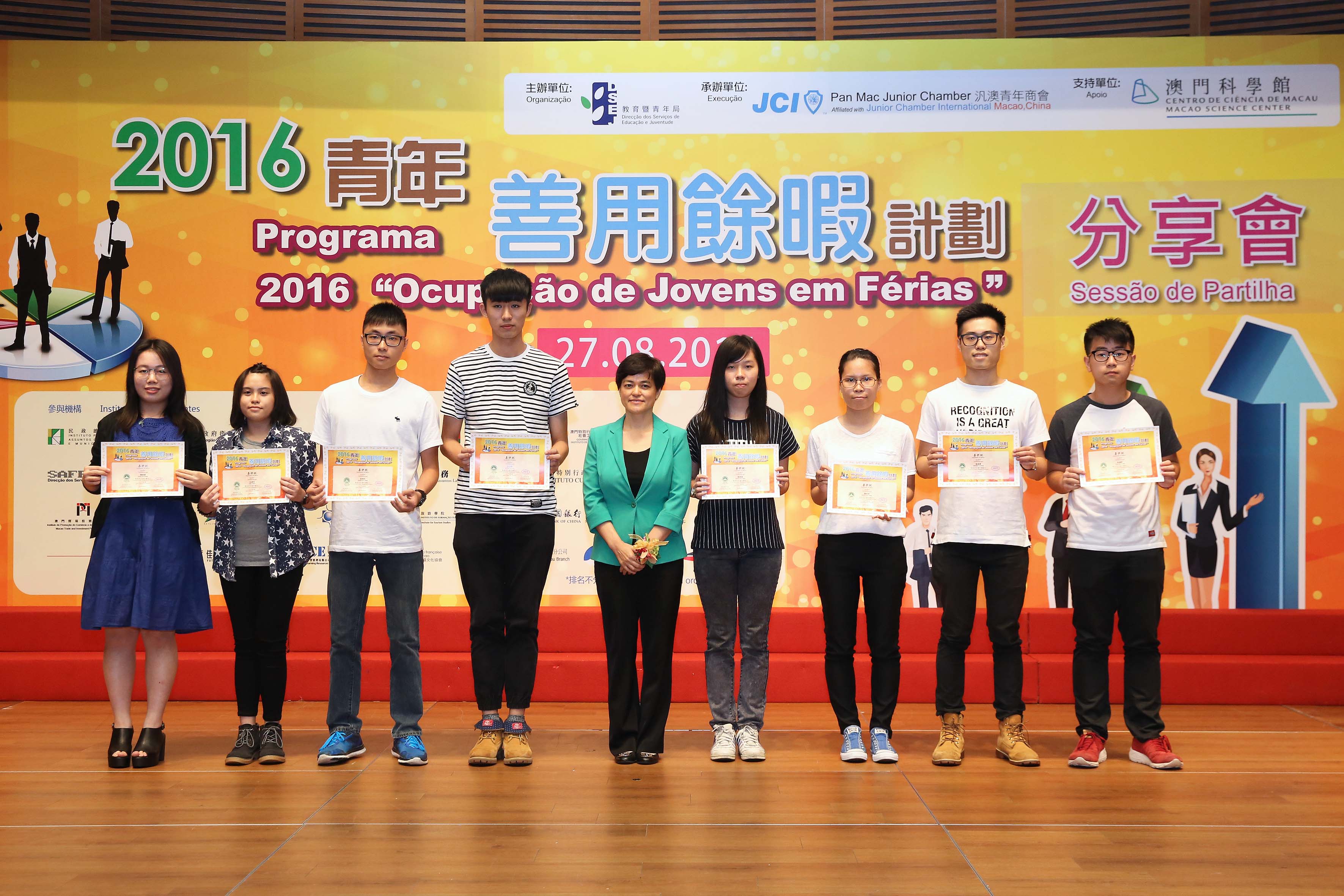 Em articulação com a “Política de Juventude de Macau” na sua vertente de “promoção da mobilidade social” e, em paralelo, com o reforço dos trabalhos de aconselhamento de carreira para os jovens, realizou-se, com sucesso, o Programa “Ocupação de Jovens em Férias 2016”, organizado pelo pela Direcção dos Serviços de Educação e Juventude (DSEJ) em colaboração com a Associação de Jovens Empresários Pan Mac, contando, ainda, com apoio do Centro de Ciência de Macau, S.A. e com participação conjunta de 36 serviços públicos e instituições particulares de Macau. O referido programa atraiu a inscrição de 1.558 jovens, tendo sido analisados e seleccionados, para nele participarem, 438 jovens. Os participantes participaram numa série de formações e actividades de estágio sobre planeamento da carreira. O Programa iniciou-se em 2 de Julho e terminou no dia 26 de Agosto. Para agradecer a todas instituições participantes e para atribuir certificados de mérito aos excelentes estagiários do Programa, foi realizada, pelo organizador, a sessão de partilha no dia 27 de Agosto (sábado), pelas 15h00, no Centro de Convenções do Centro de Ciência de Macau.