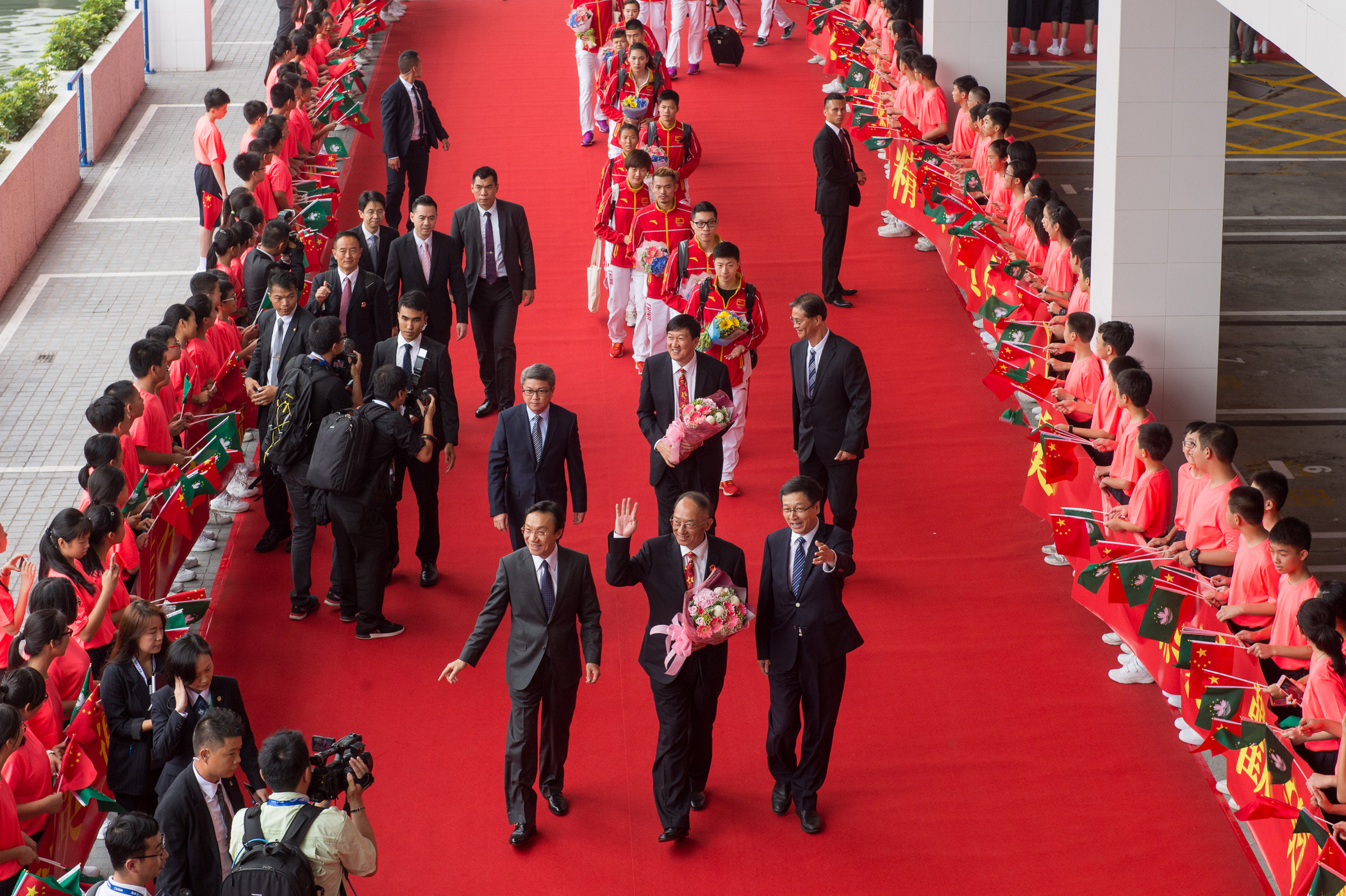 A delegação desportiva, liderada pelo director da Administração-Geral dos Desportos e presidente do Comité Olímpico, Liu Peng, e pelo subdirector da Administração-Geral dos Desportos, Gao Zhidan, partiu, esta tarde, no barco, de Hong Kong para Macau. O secretário para os Assuntos Sociais e Cultura, Alexis Tam, vice-director do Gabinete de Ligação do Governo Central da República Popular da China na RAEM, Sun Da, e outros representantes receberam, em nome do Governo da RAEM, a delegação, juntamente com cerca de 235 alunos que deram a boas-vindas e 15 alunos que ofereceram ramos de flores.